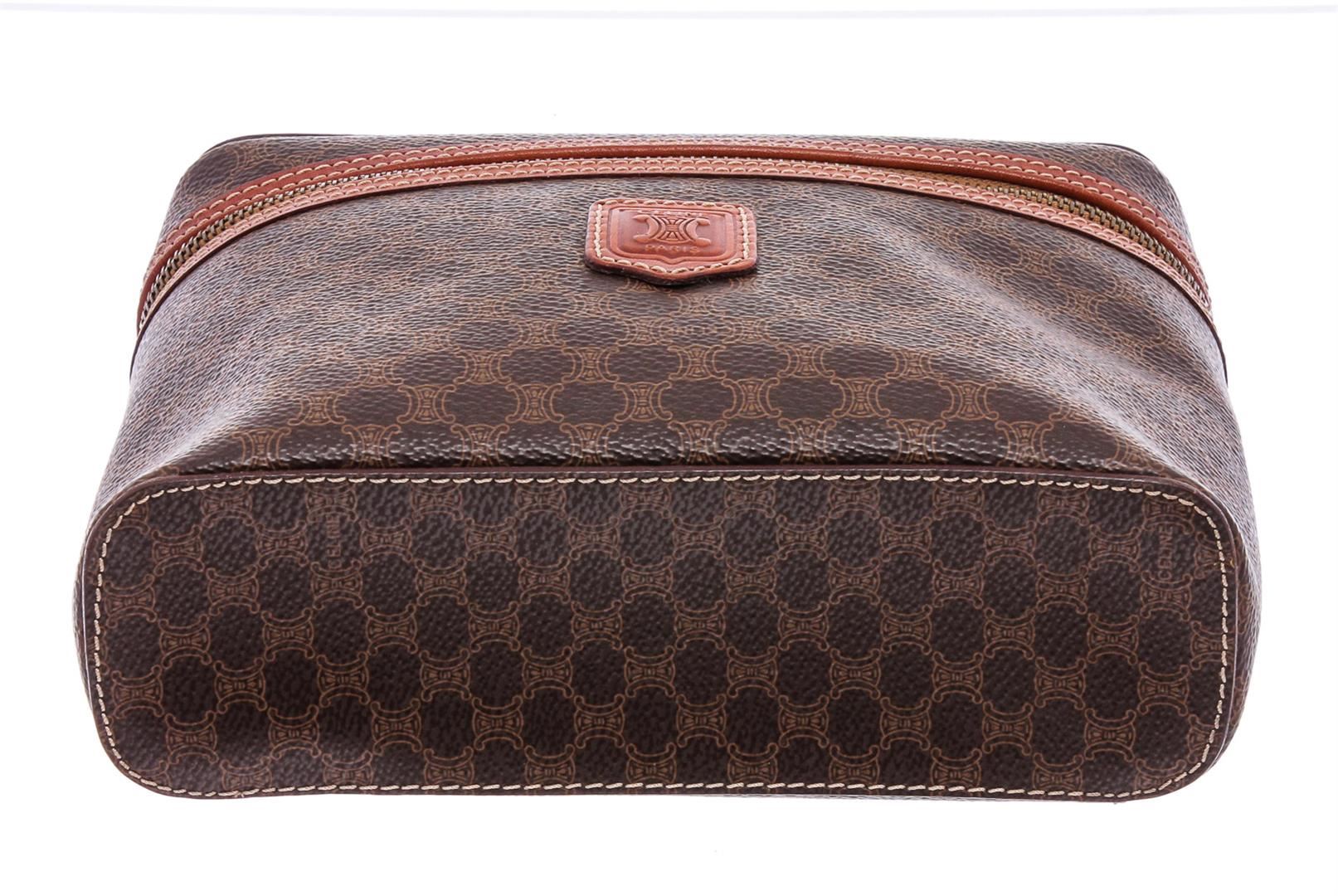 One Celine Brown Monogram Coated Canvas Leather Cosmetic Vanity Bag. Brown and tan monogram coated canvas vintage Celine cosmetic pouch with gold-tone hardware, single flat top handle, brown leather trim, debossed logo adornment at front, tan coated canvas lining and zip closure at top.