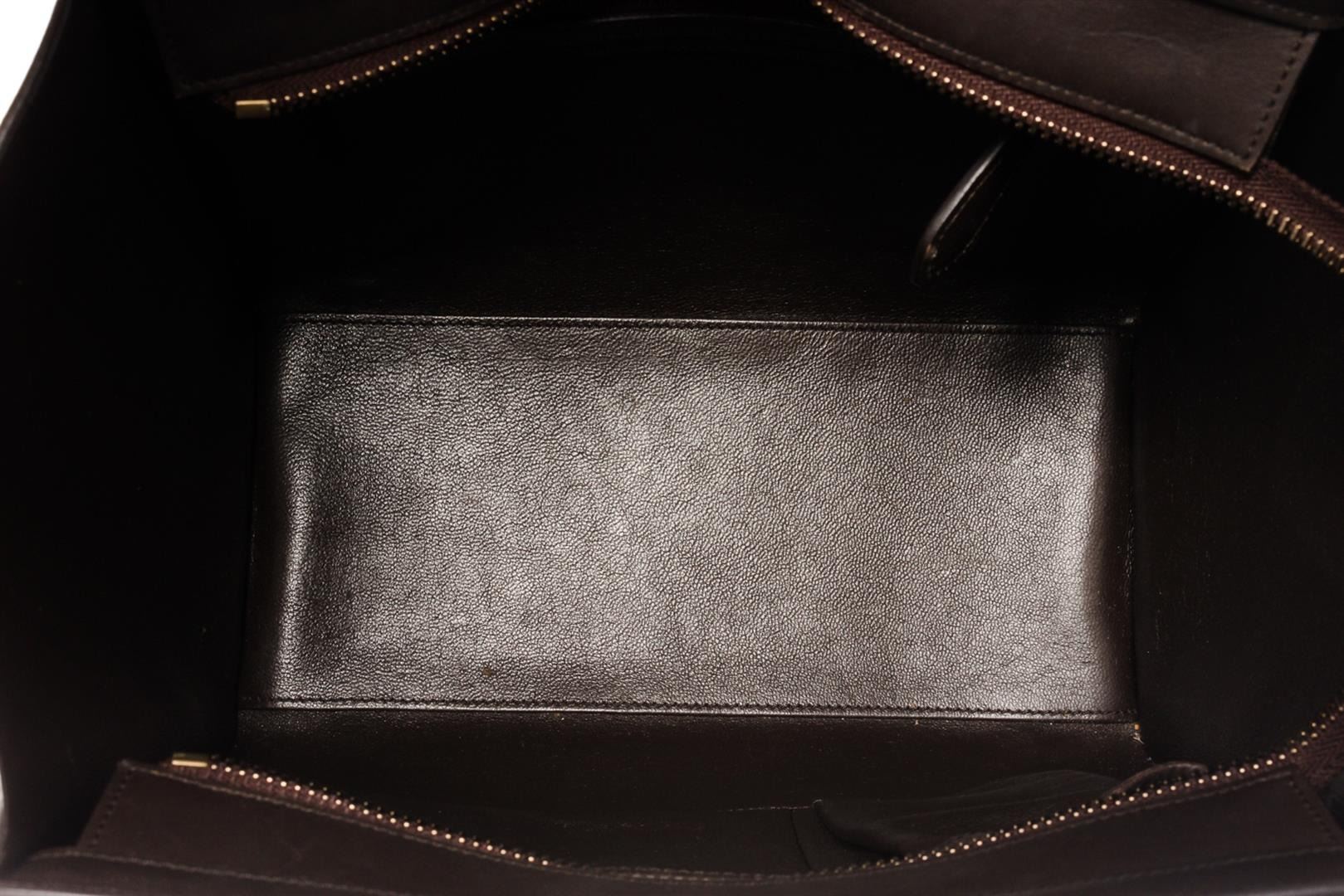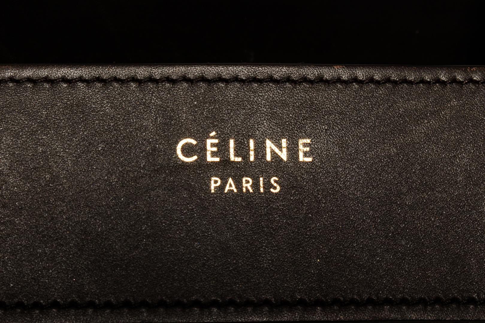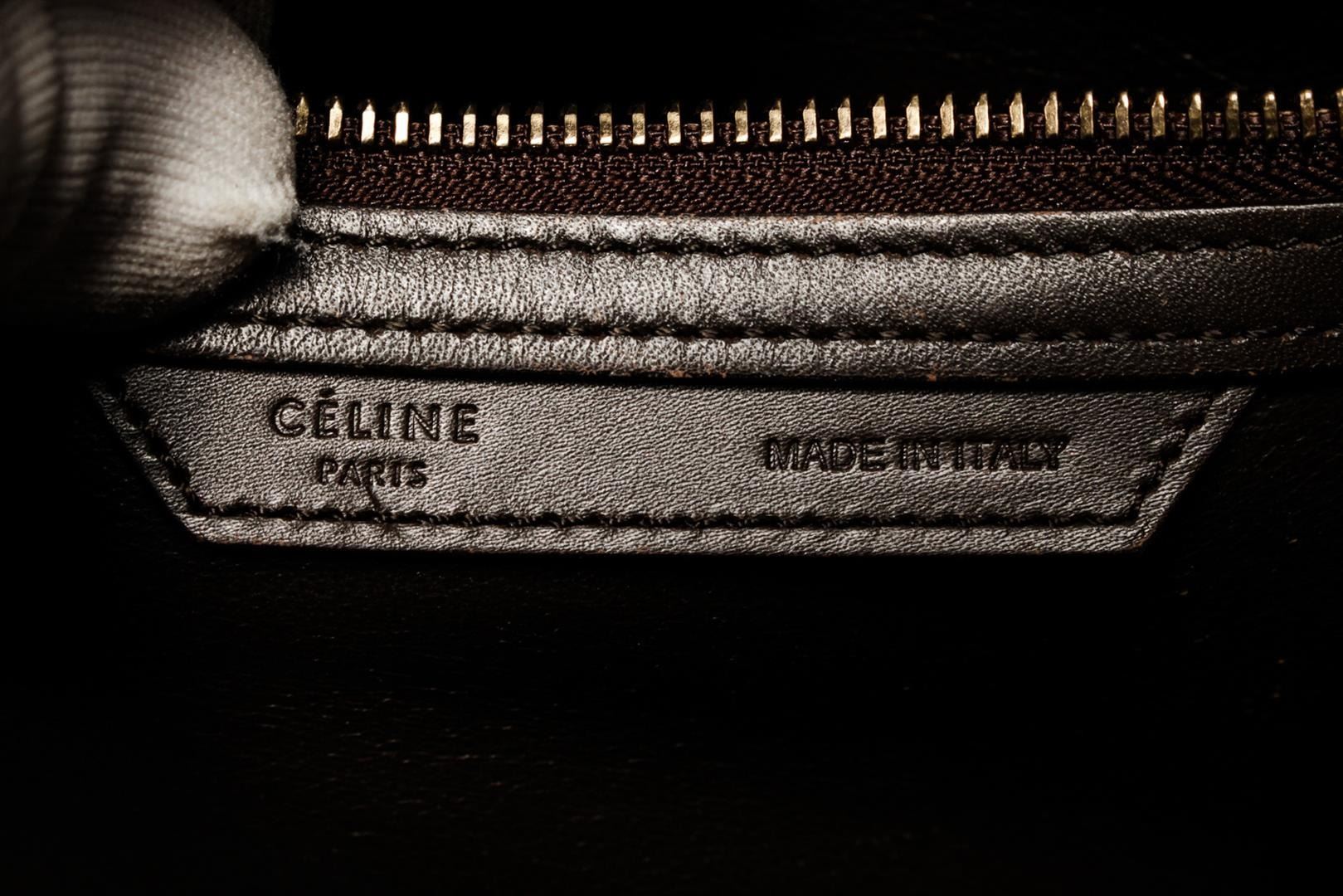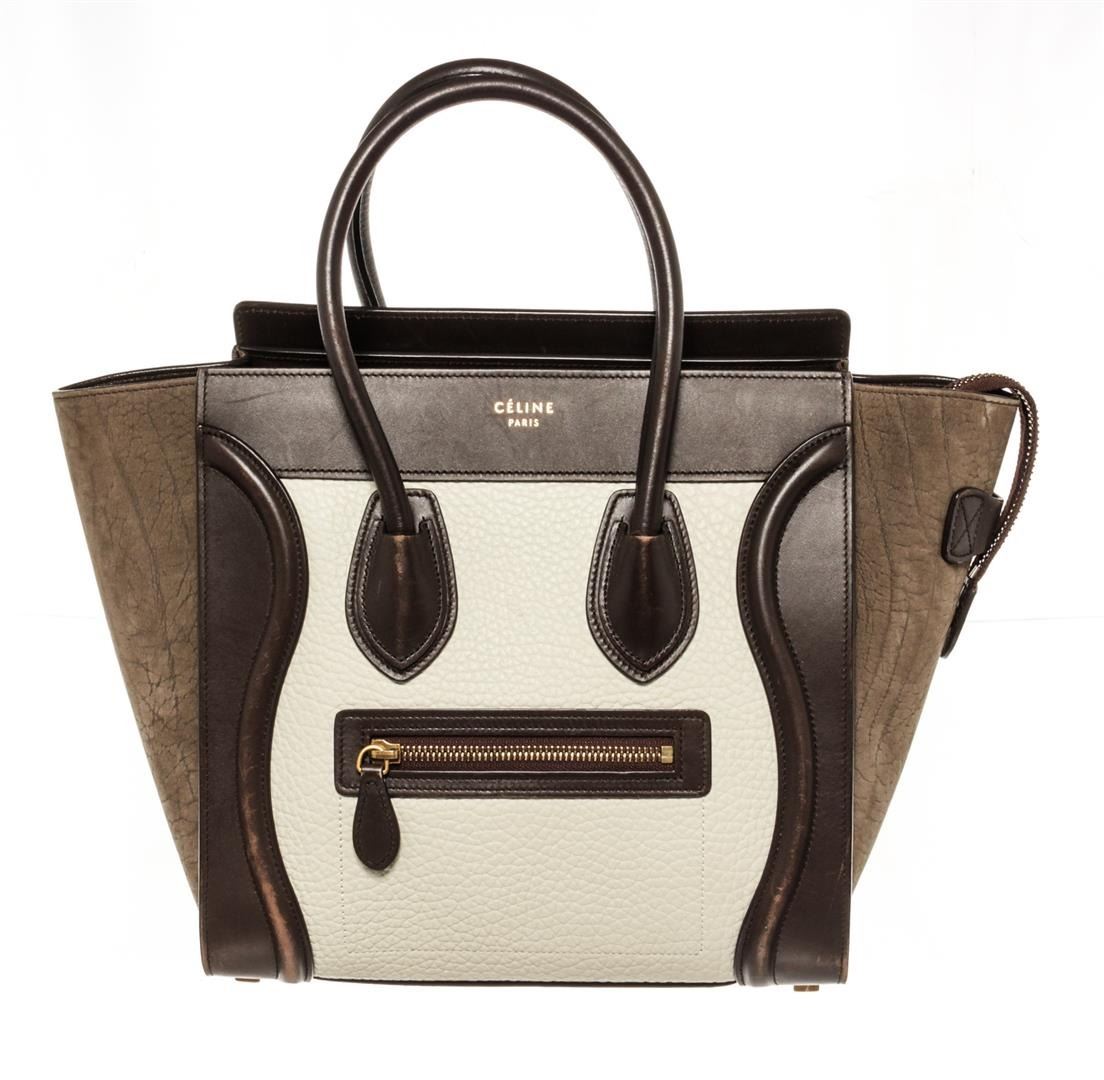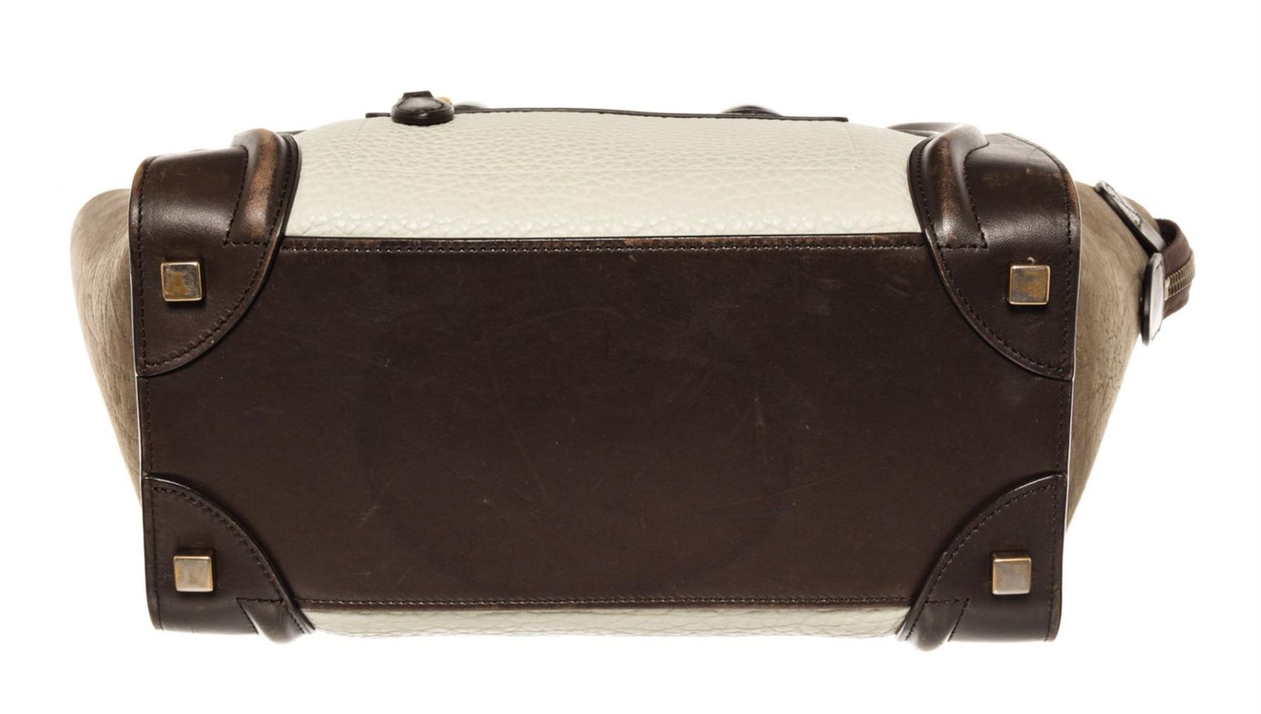 Celine Multicolor Mini Luggage with brown and ivory leather, brown suede, gold-tone hardware, dual rolled top handles, single zip pocket and foil-stamped logo at front face, protective feet at base, brown leather lining, three pockets at interior walls; o