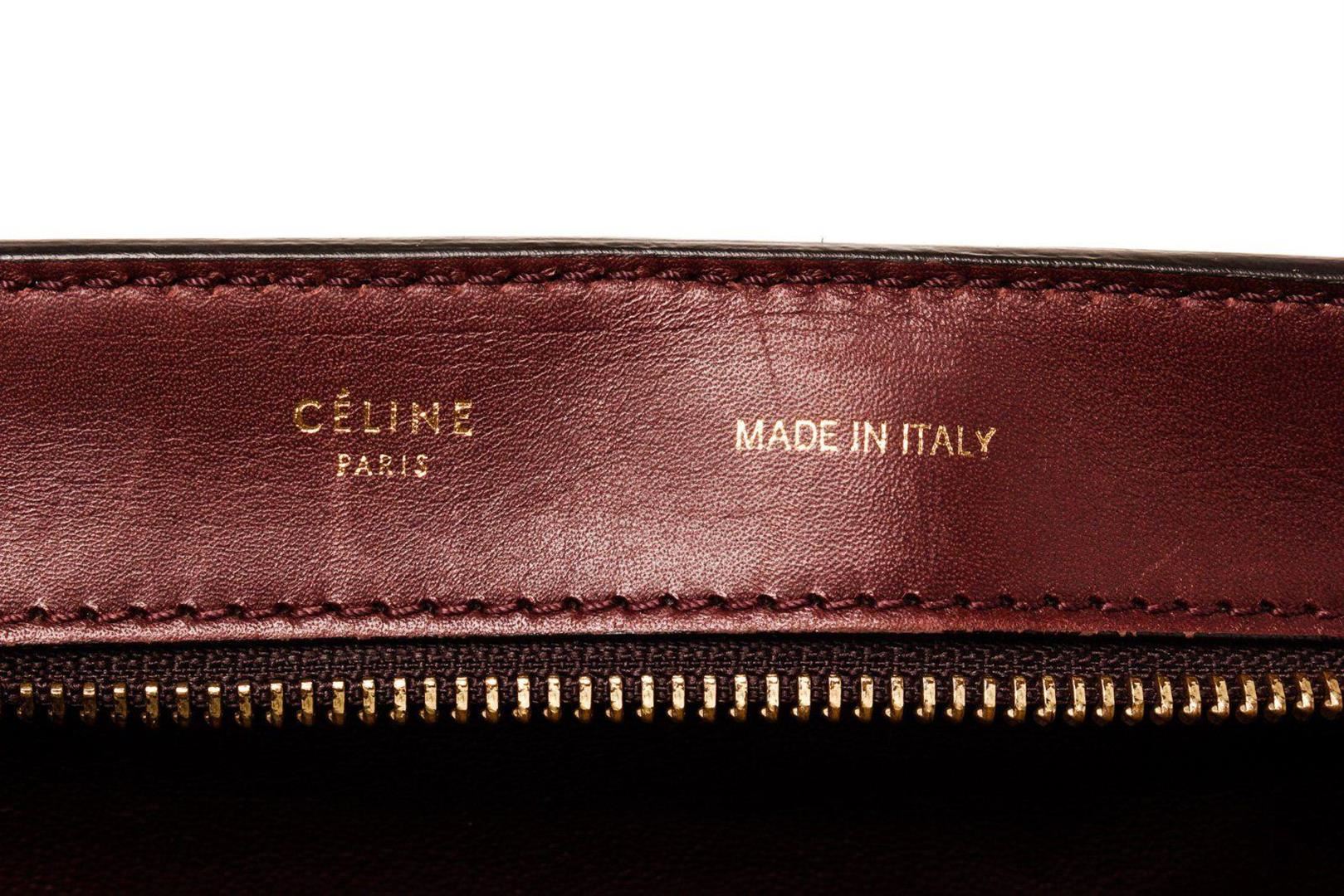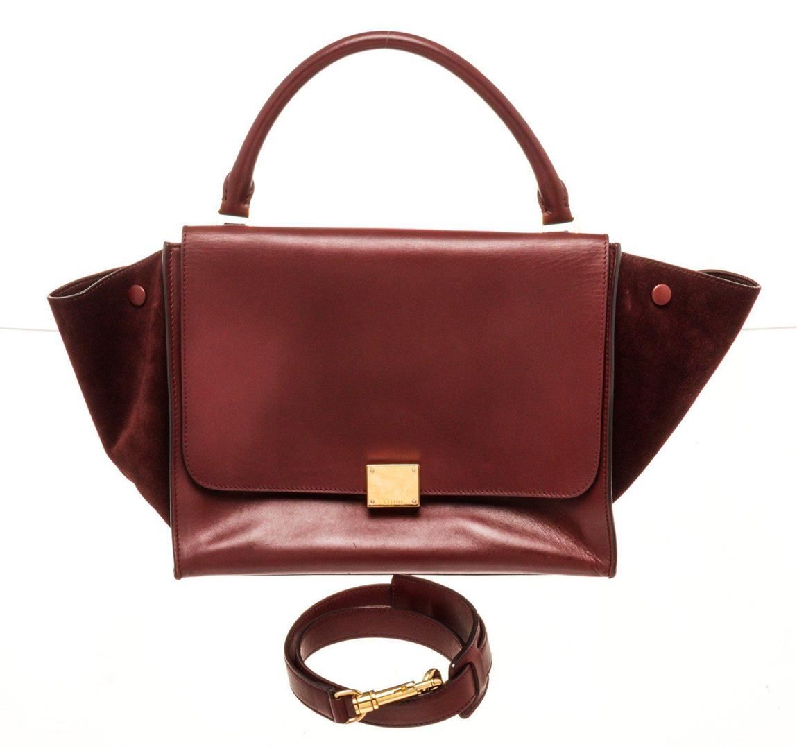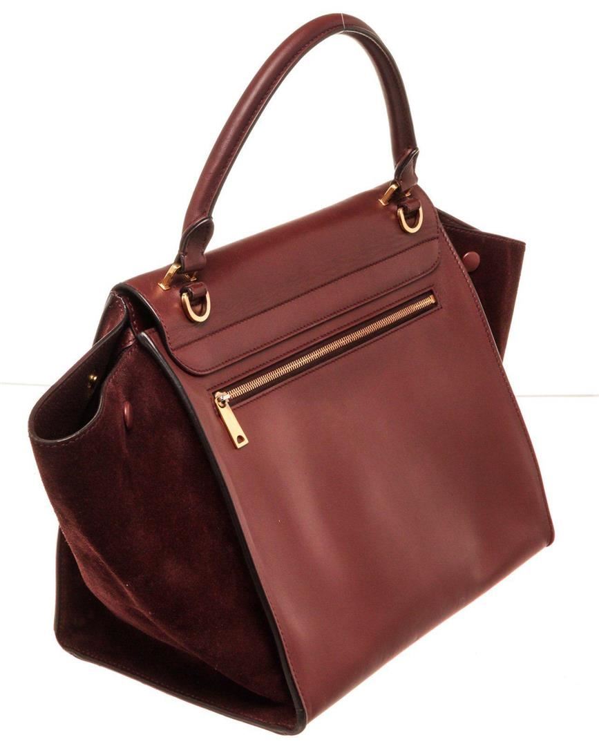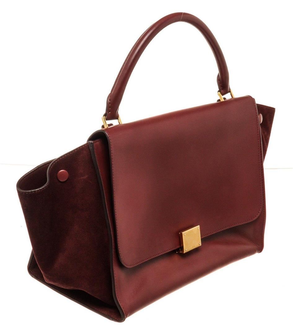 Celine Burgundy Leather Suede Trapeze Tote Bag with leather, gold-tone hardware, exterior zip pockets, interior slip pockets, top handle and push lock closure.