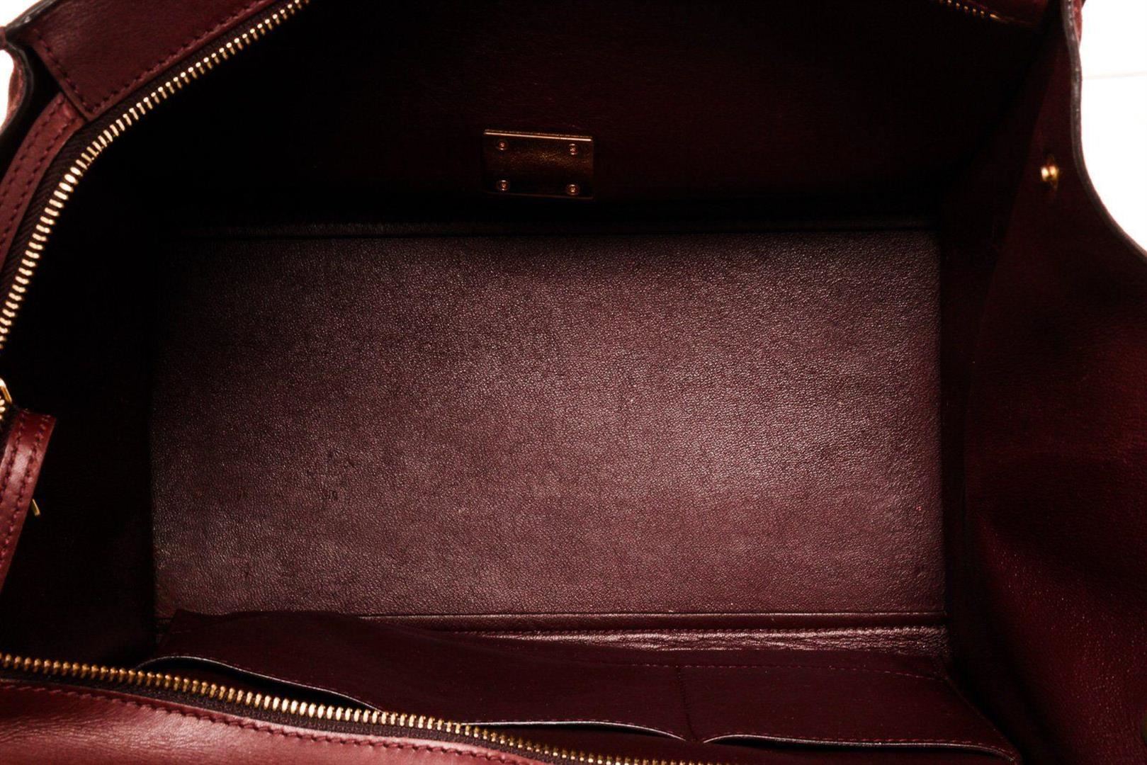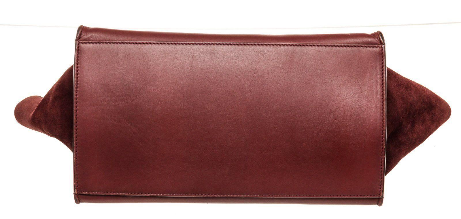 Celine Burgundy Leather Suede Trapeze Tote Bag with leather, gold-tone hardware, exterior zip pockets, interior slip pockets, top handle and push lock closure.