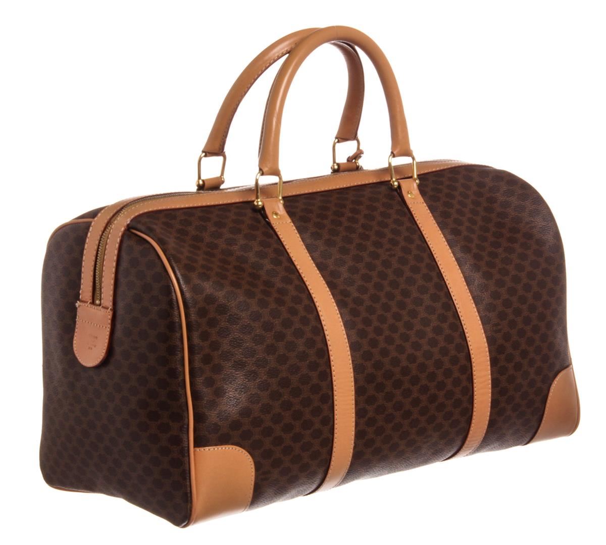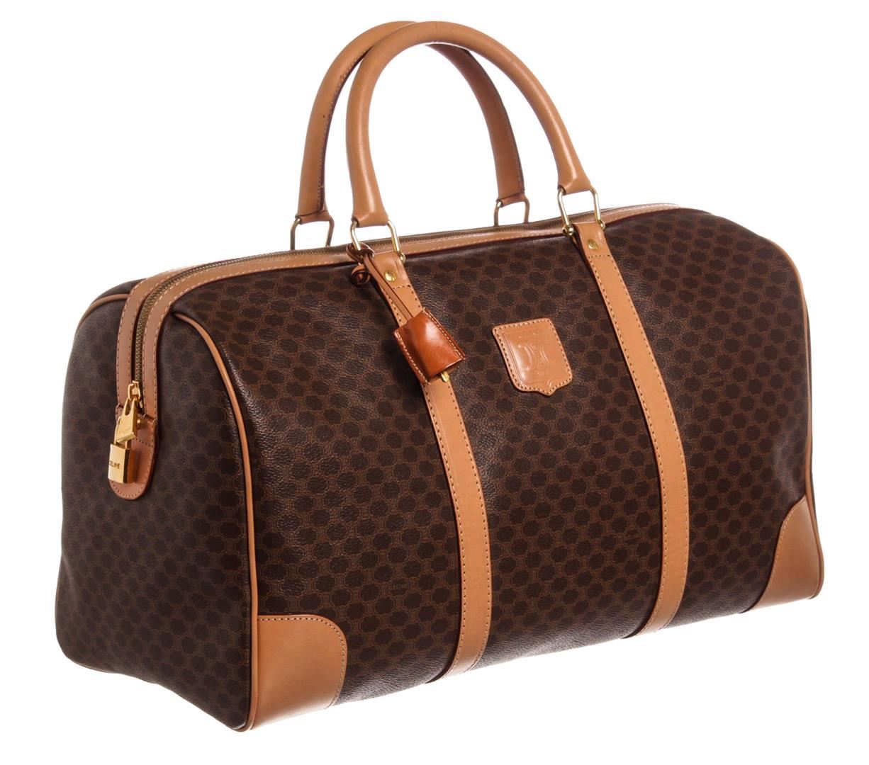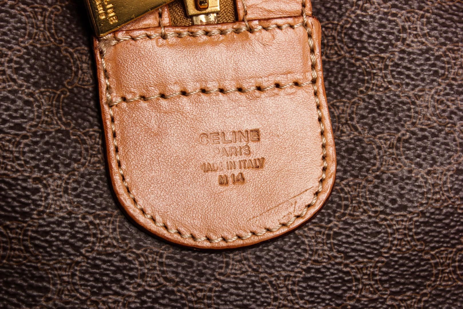 Brown and tan monogram coated canvas Céline Macadam duffle bag with gold-tone hardware, tan leather trim, dual rolled top handles, brown canvas lining, single zip pocket at interior wall and zip closure at top.