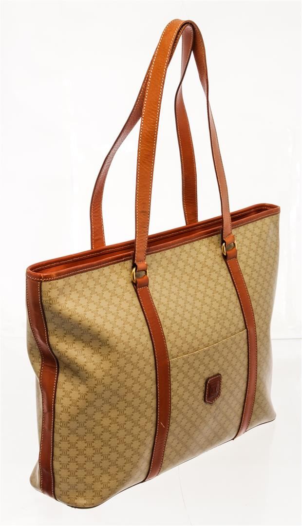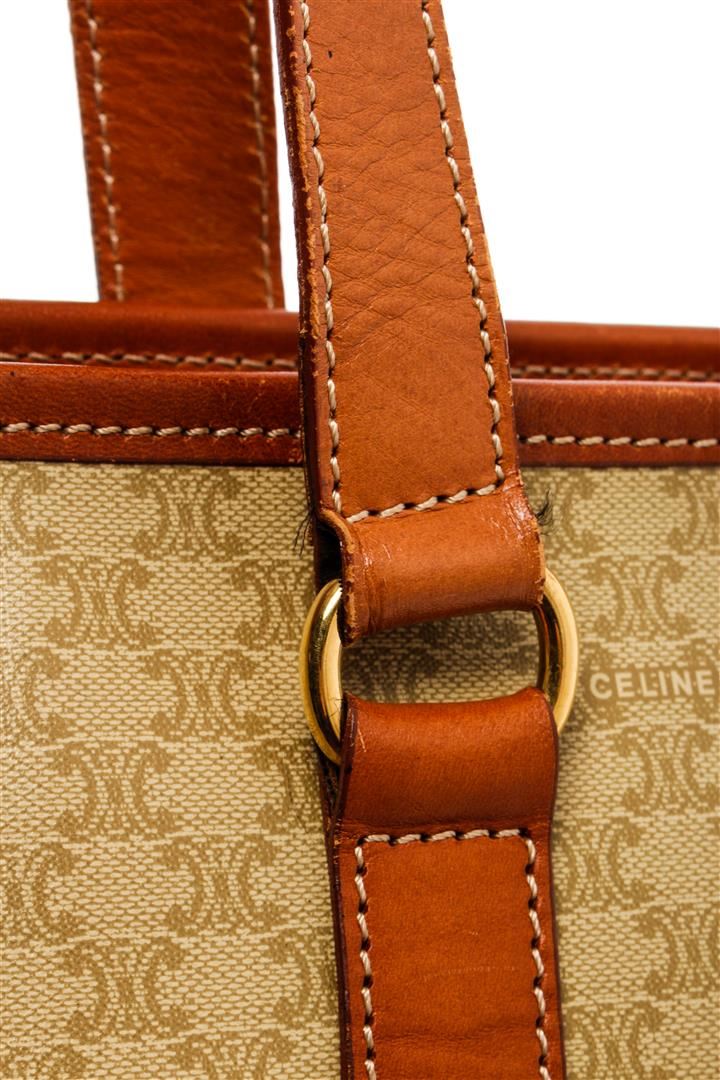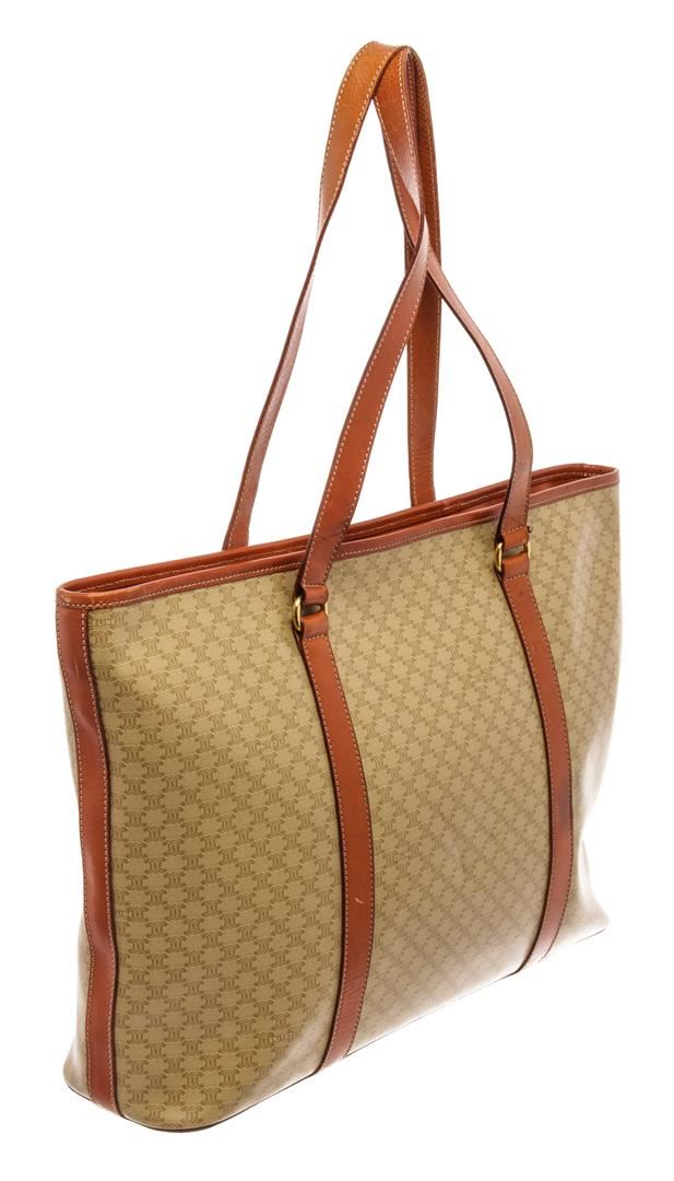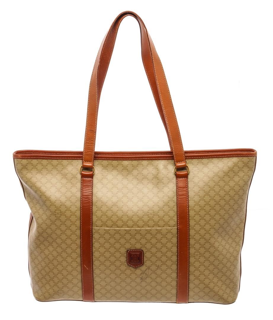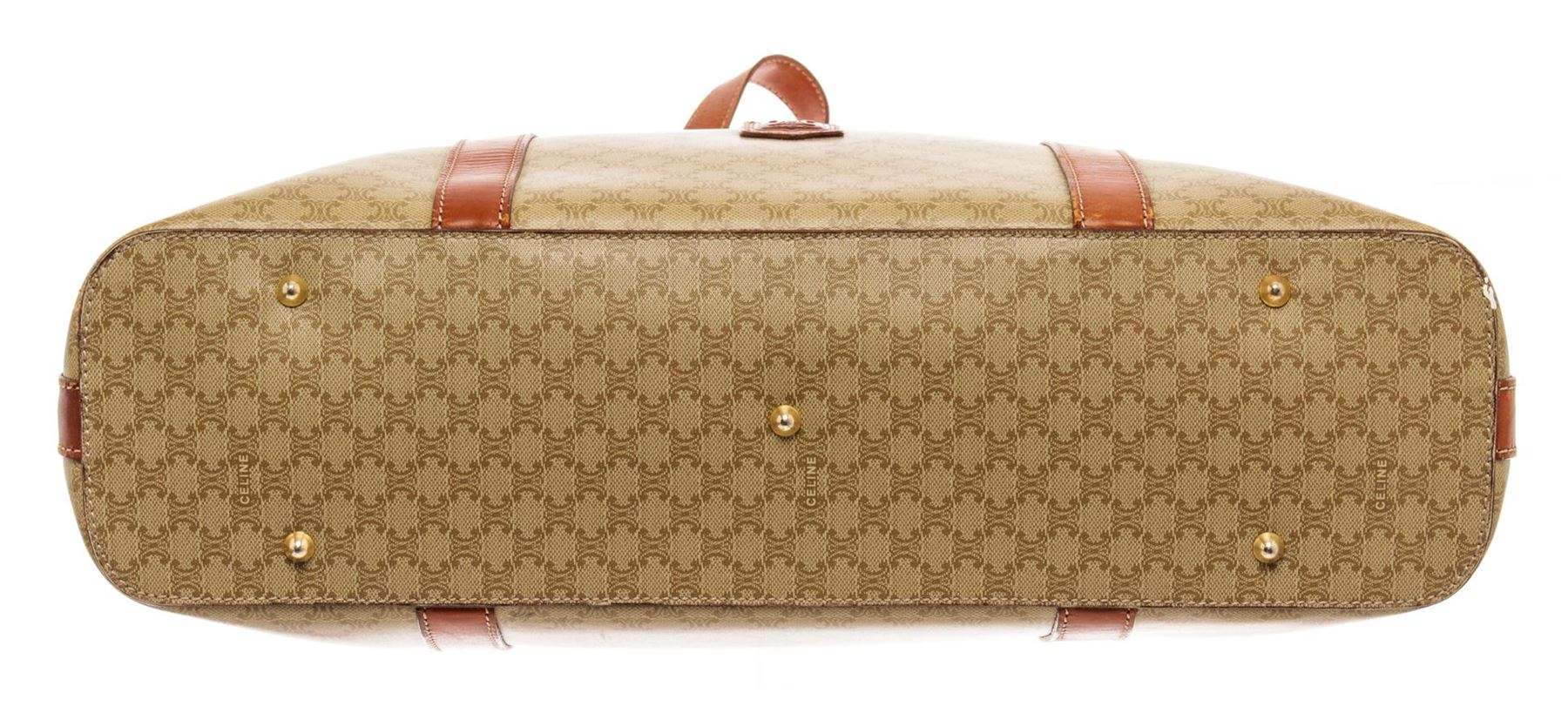 Celine Cream Beige Leather Macadam Tote Bag. All available information is listed in the description and shown in the photos. Celine Cream Beige Leather Macadam Tote Bag with leather macadam monogram print, gold-tone hardware, logo patch to the front, internal logo patch, top zip fastening, flat top handles, internal zip fastening pocket, front slip pocket, leather lining, zip closure at top. Height: 11.8" Width: 15.9" Depth: 4.3", Shoulder Strap Drop : 10.2" / 30 x 40.5 x 11 Cm