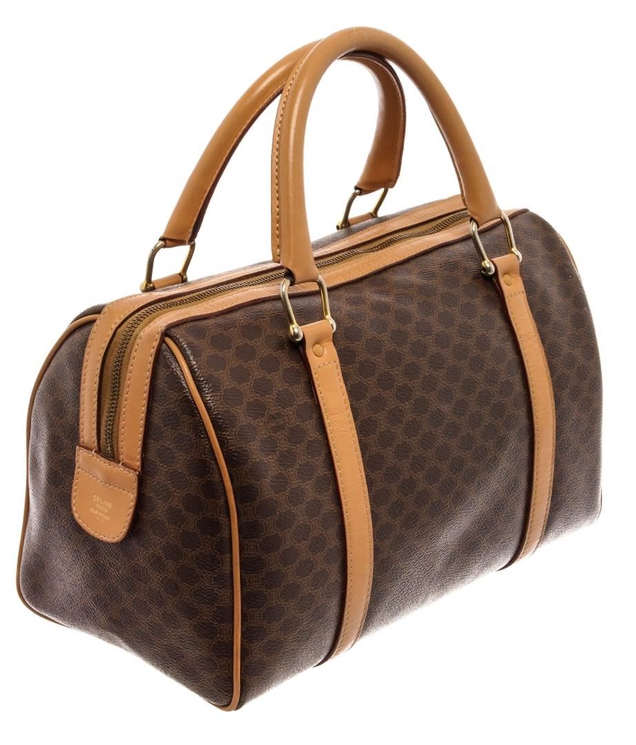 Celine Dark Brown and Tan Leather Macadam Boston Bag. All available information is listed in the description and shown in the photos. Celine Dark Brown and Tan Leather Macadam Boston Bag with gold-tone hardware, leather trim, dual rolled handles, leather trim embellishment, leather lining & single interior pocket, zip closure at top, protective feet at base. Height: 7.5" Width: 12" Depth: 6", Handle Drop: 3.5" / 19.05 x 30.48 x 15.24 Cm