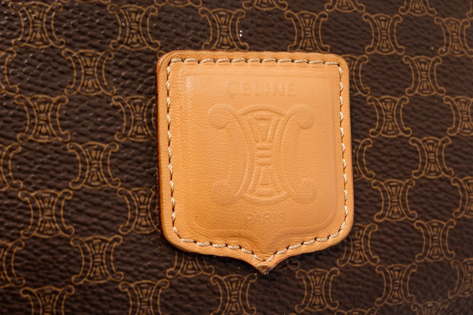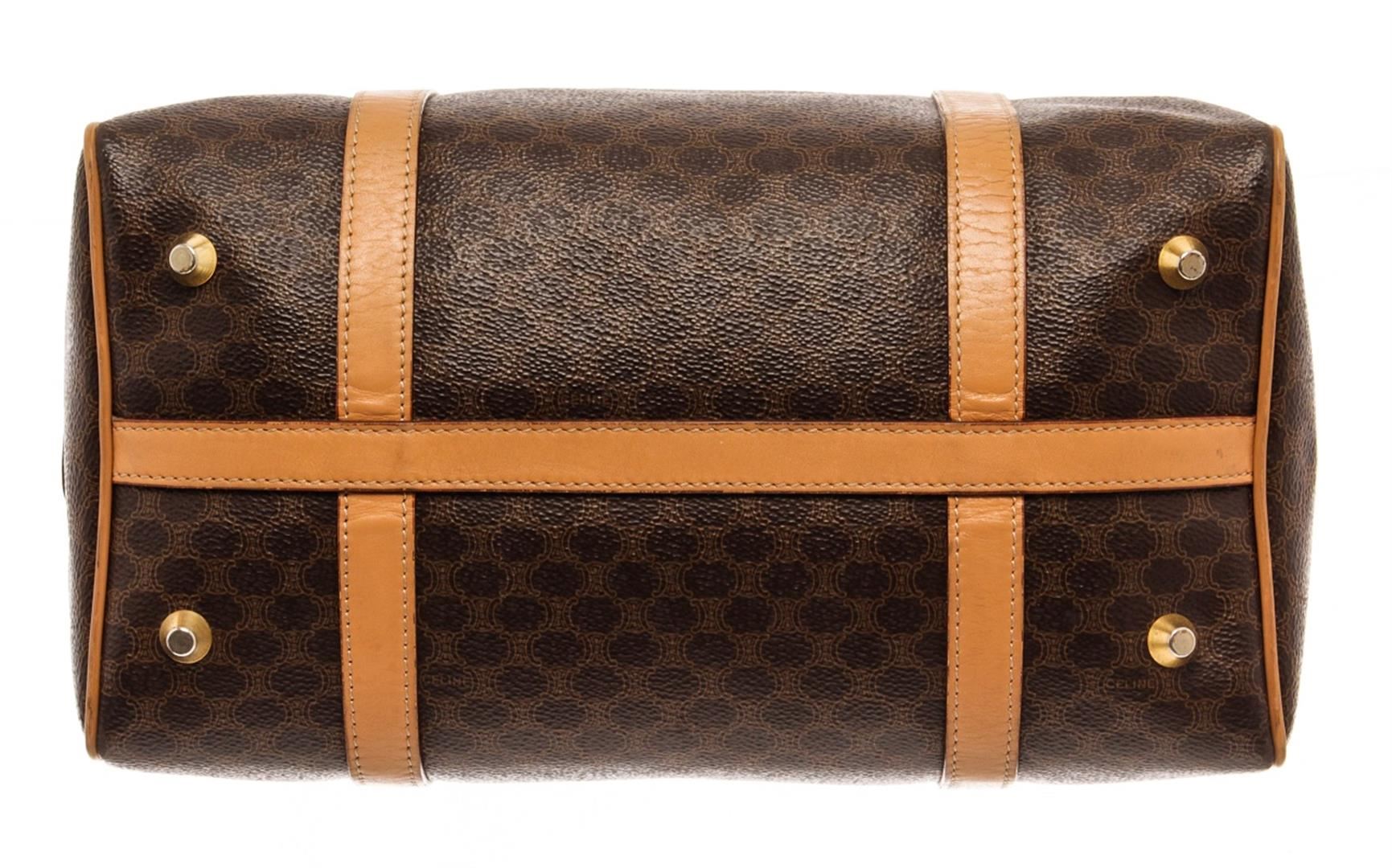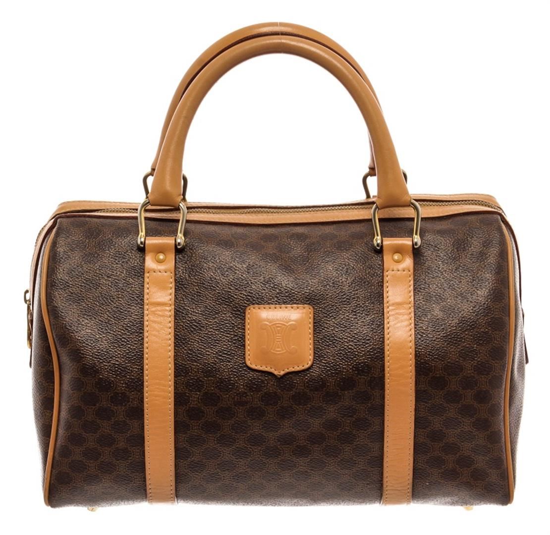 Celine Dark Brown and Tan Leather Macadam Boston Bag. All available information is listed in the description and shown in the photos. Celine Dark Brown and Tan Leather Macadam Boston Bag with gold-tone hardware, leather trim, dual rolled handles, leather trim embellishment, leather lining & single interior pocket, zip closure at top, protective feet at base. Height: 7.5" Width: 12" Depth: 6", Handle Drop: 3.5" / 19.05 x 30.48 x 15.24 Cm