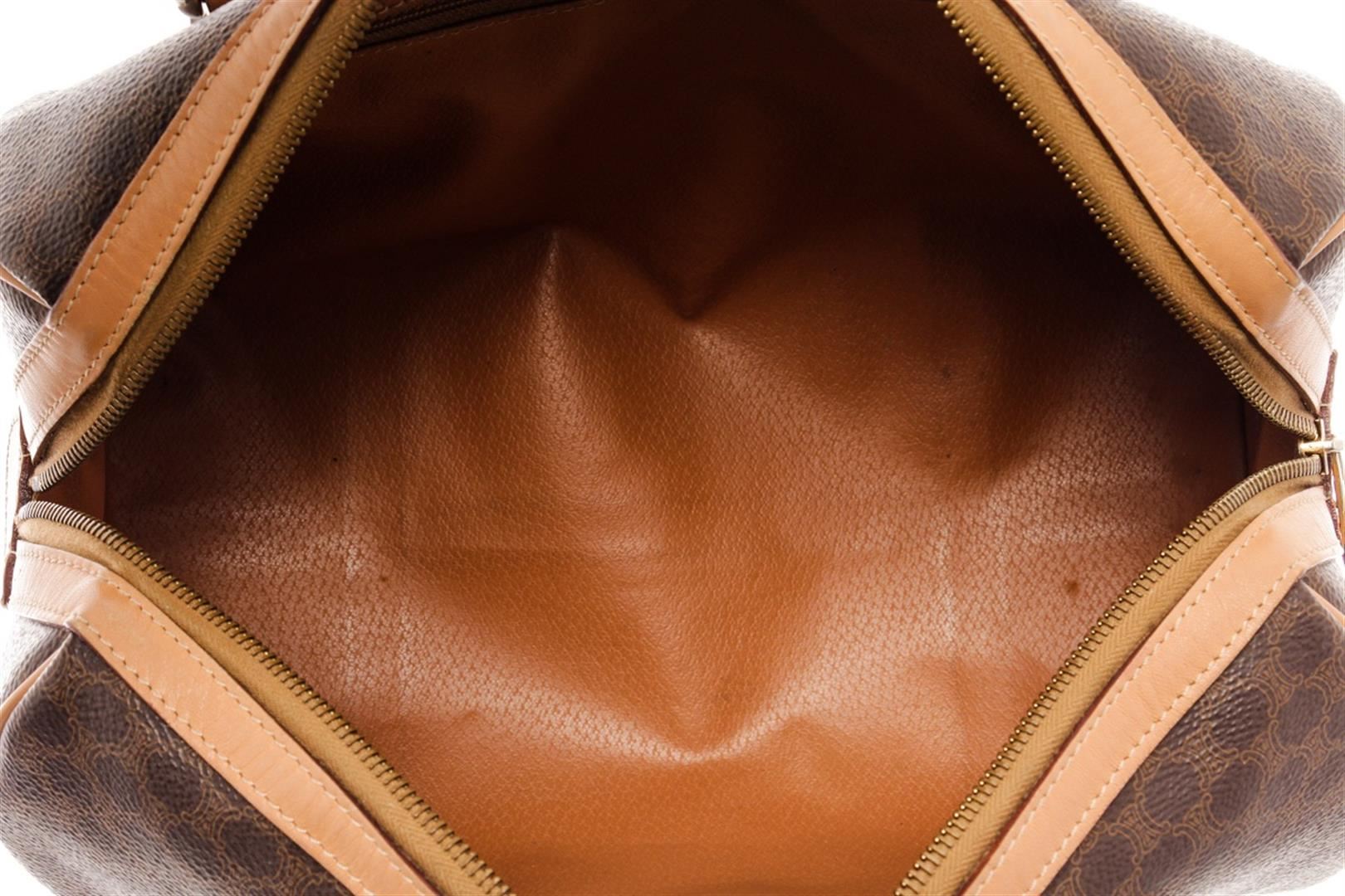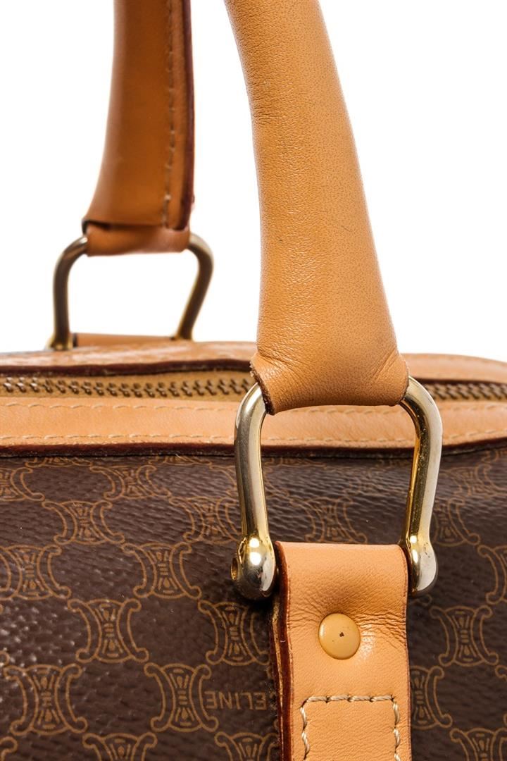 Celine Dark Brown and Tan Leather Macadam Boston Bag. All available information is listed in the description and shown in the photos. Celine Dark Brown and Tan Leather Macadam Boston Bag with gold-tone hardware, leather trim, dual rolled handles, leather trim embellishment, leather lining & single interior pocket, zip closure at top, protective feet at base. Height: 7.5" Width: 12" Depth: 6", Handle Drop: 3.5" / 19.05 x 30.48 x 15.24 Cm