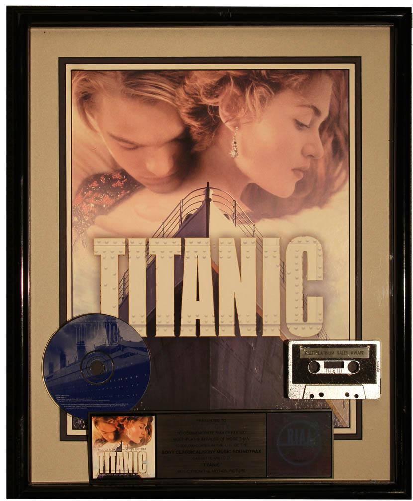 RIAA platinum award for Celine Dion's ''Titanic'' soundtrack, presented to Music City for the sale of 10,000,000 CD's and cassettes. Framed award includes a poster from the film, a platinum-colored cassette tape reading ''Multi-Platinum Sales Award,'' a ''Titanic'' CD and a commemorative plaque with an official RIAA (Recording Industry Association of America) hologram certifying the award. Frame measures 17'' x 21'' with minor scratches to top, else near fine.