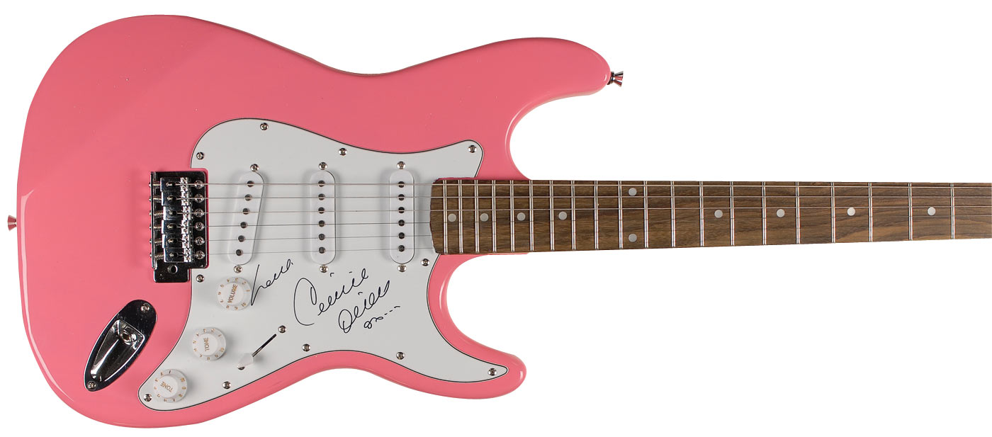 Pink-bodied Stedman Pro ‘stratocaster-style’ electric guitar signed in black felt tip on the white pickguard, “Love, Celine Dion.” In fine condition. Oversized.