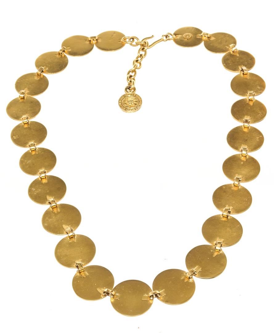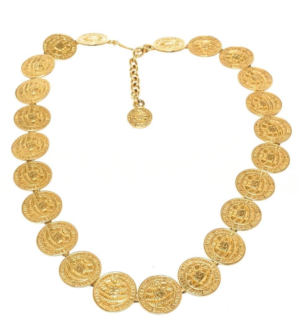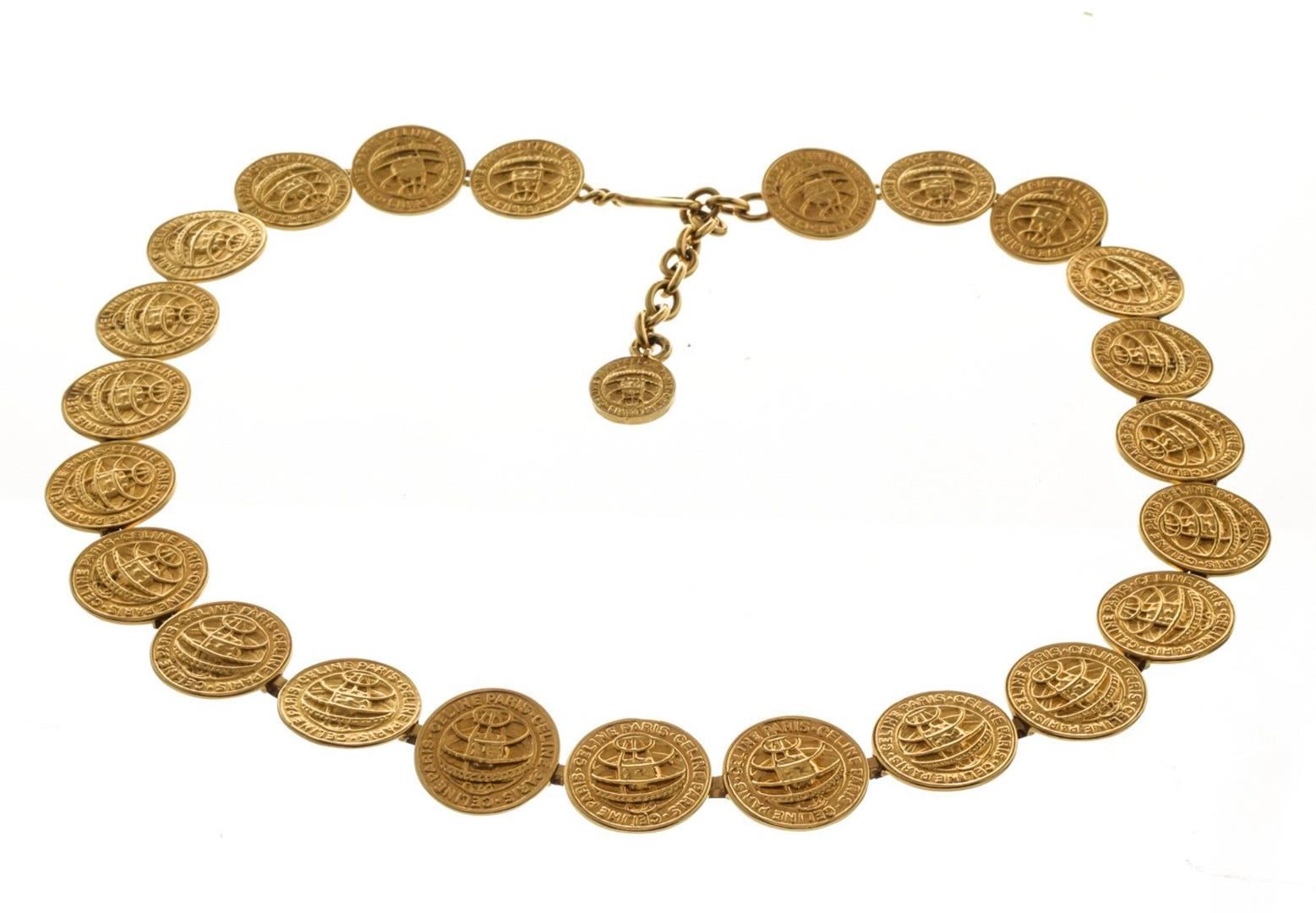 Gold-tone metal Paris token Celine belt with chain and adjustable hook closure.