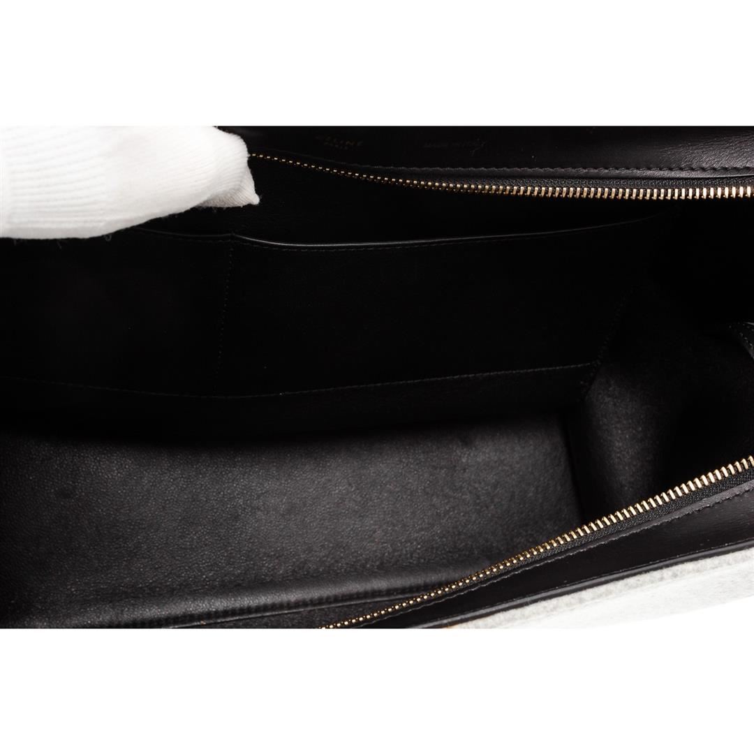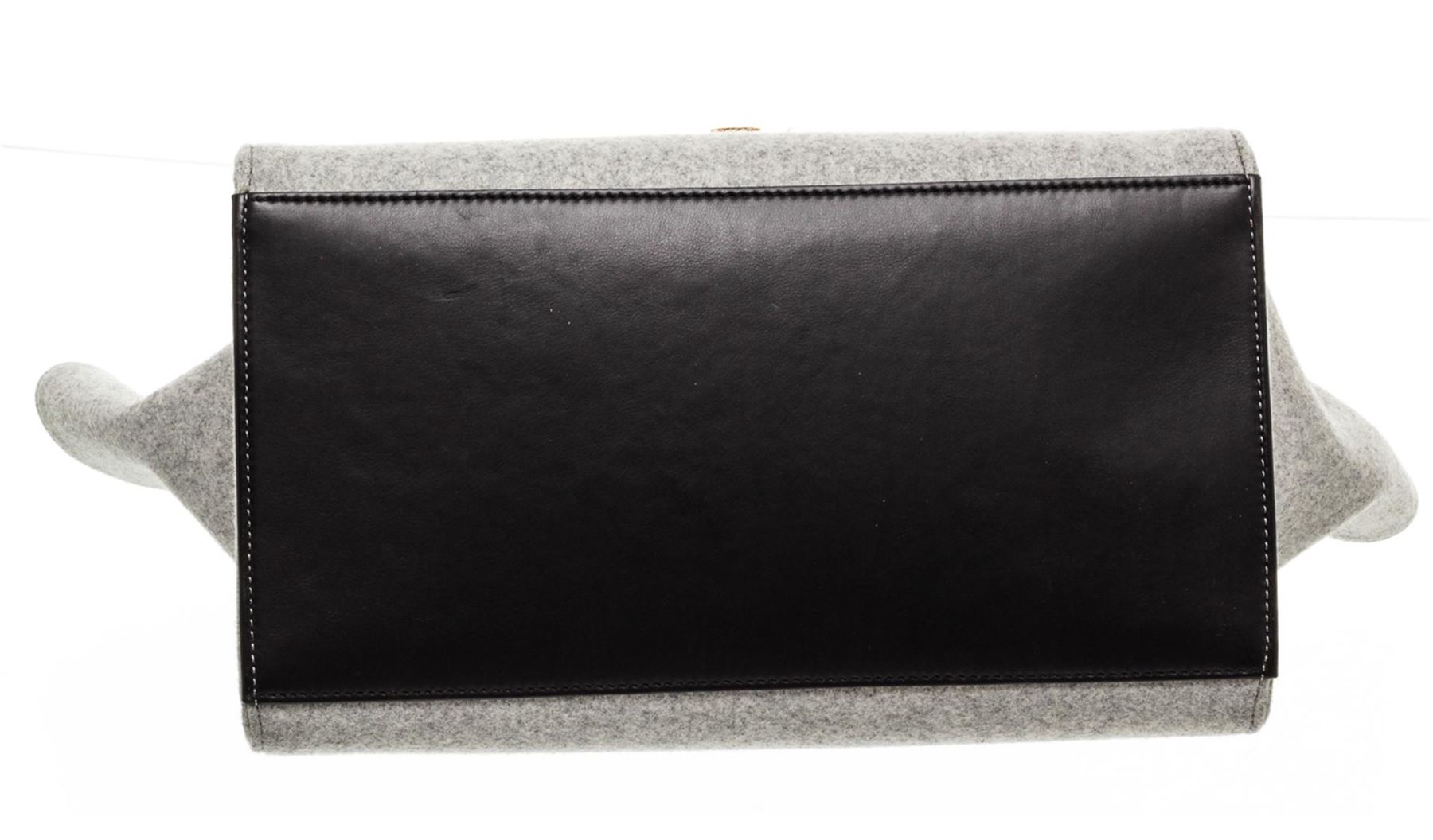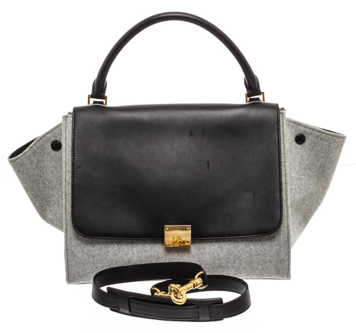 Celine gray wool Medium Trapeze bag with black leather trim, gold-tone hardware, black leather lining, two interior slip pockets, snap expansions at sides, zip pocket at exterior back, optional leather shoulder strap, and zip closure at top with additional flip-lock closures at front flap. Authentic.