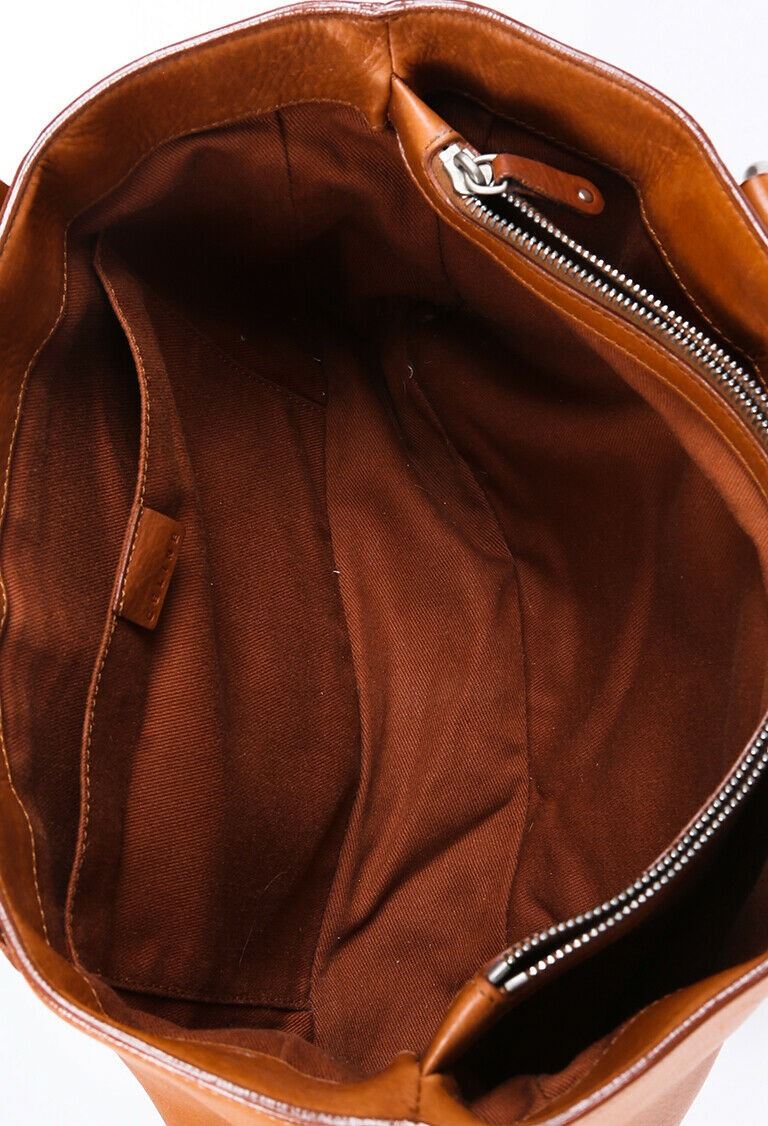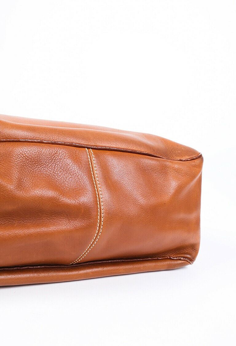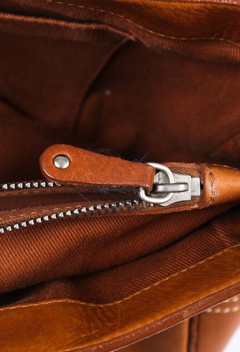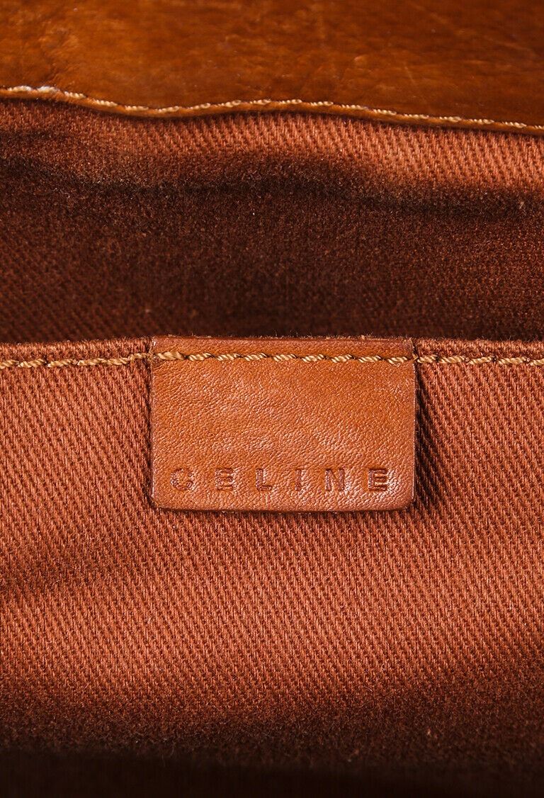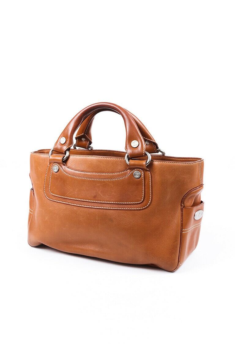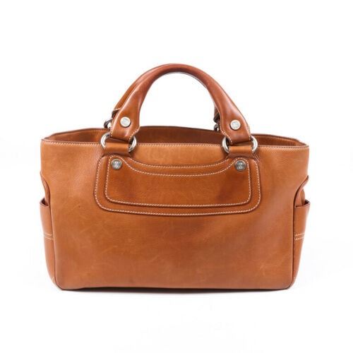 Vintage Celine leather handbag features gold tone hardware, top handles, outer slip pockets, contrast stitching, a zip closure, and a textile lined interior with pockets.