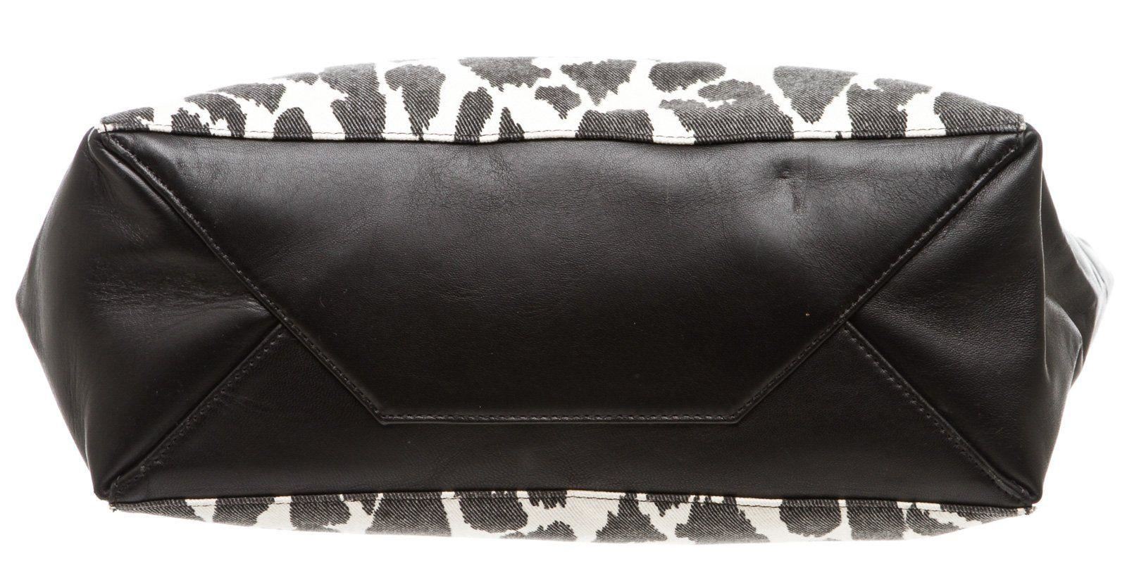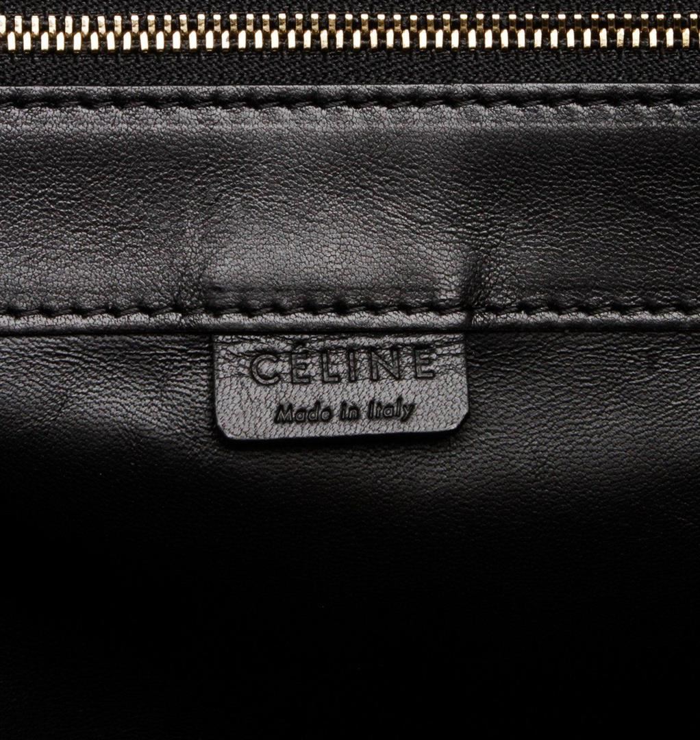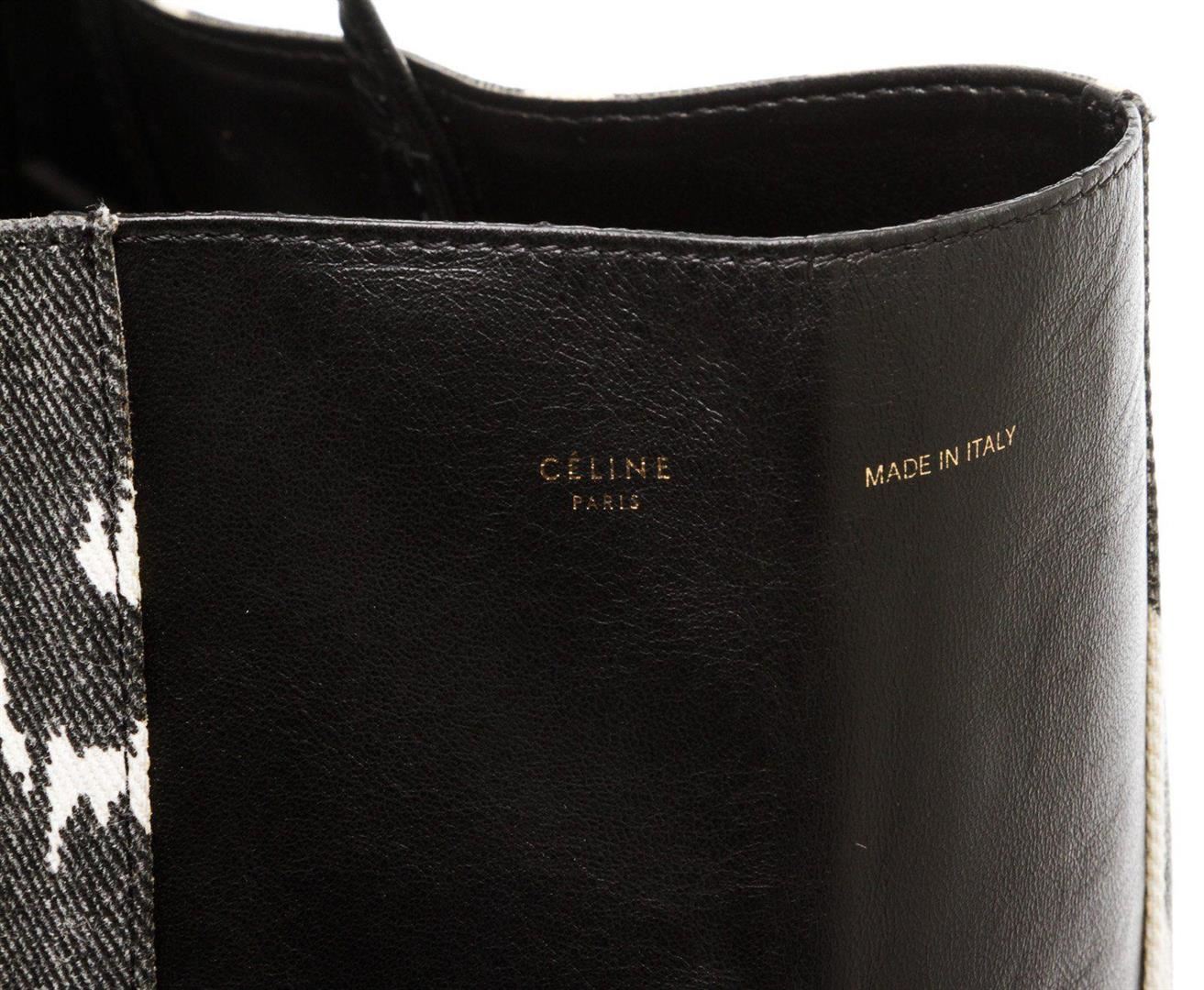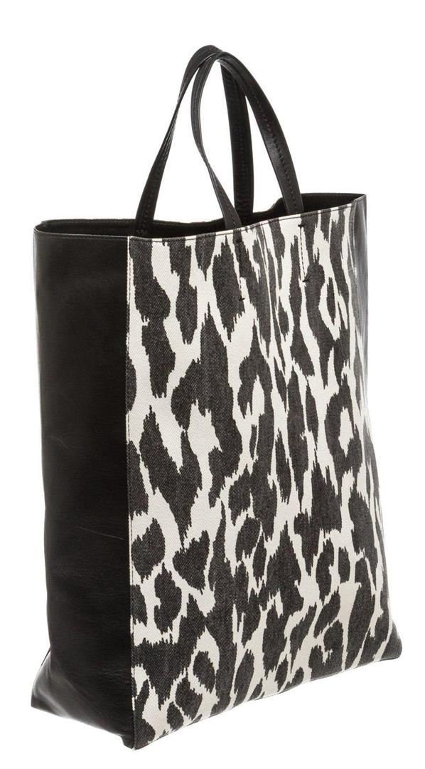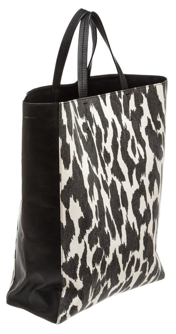Black and white leopard printed jute Celine Vertical Cabas tote with gold-tone hardware, black smooth calfskin leather trim, dual flat top handles, foil-stamped logo accent at side gusset, tonal leather lining, single interior zip pocket and open top.