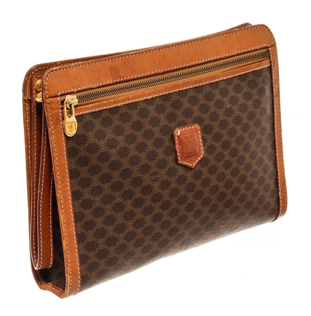 One Celine Macadam Men Clutch. Item is sold AS-IS. All available information is listed in the description and shown in the photo. Celine Macadam men clutch with contrasting trim, zipper closure, one exterior zip pocket, one interior zip pocket, and gold-toned hardware.