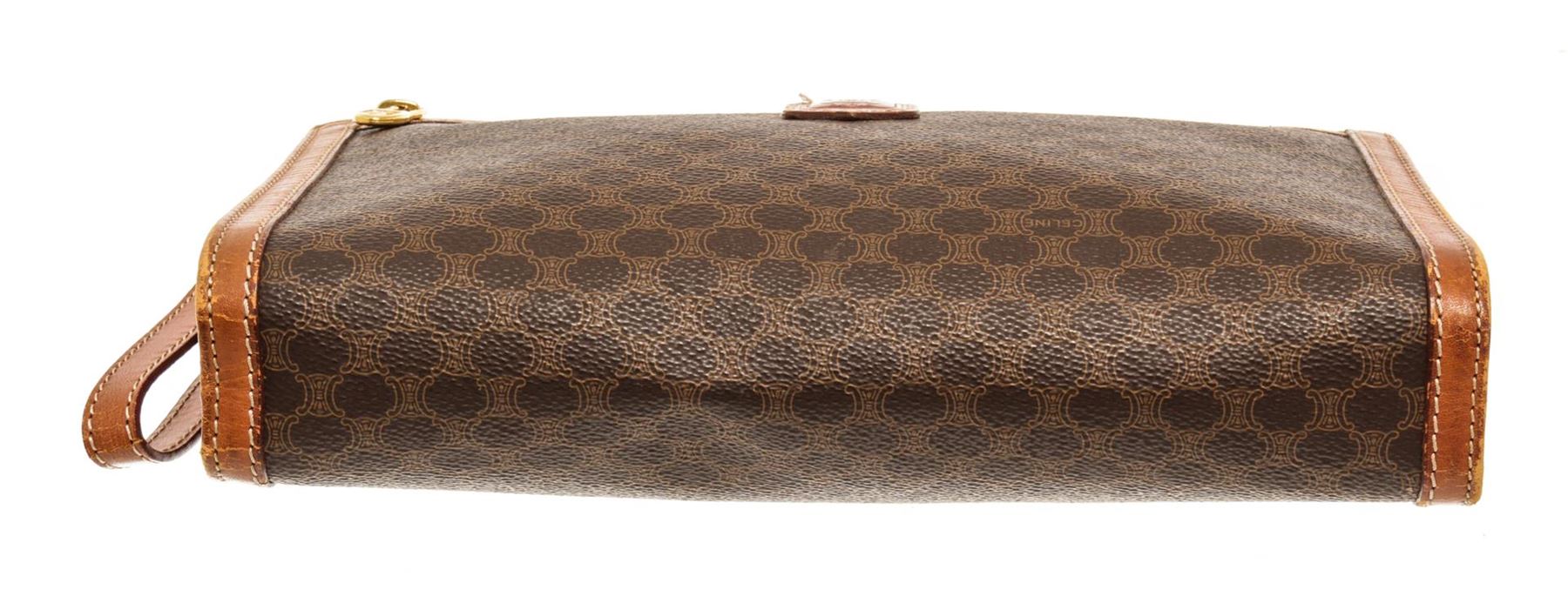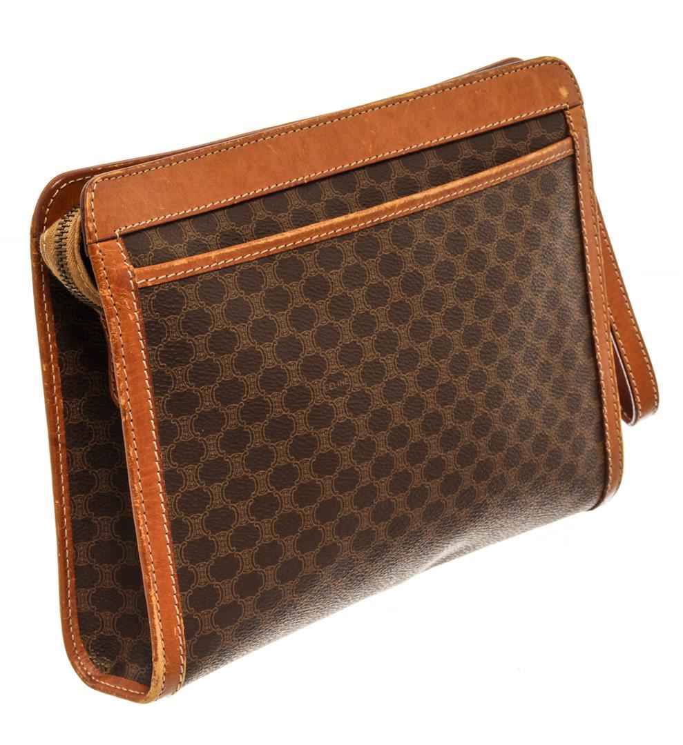 One Celine Macadam Men Clutch. Item is sold AS-IS. All available information is listed in the description and shown in the photo. Celine Macadam men clutch with contrasting trim, zipper closure, one exterior zip pocket, one interior zip pocket, and gold-toned hardware.