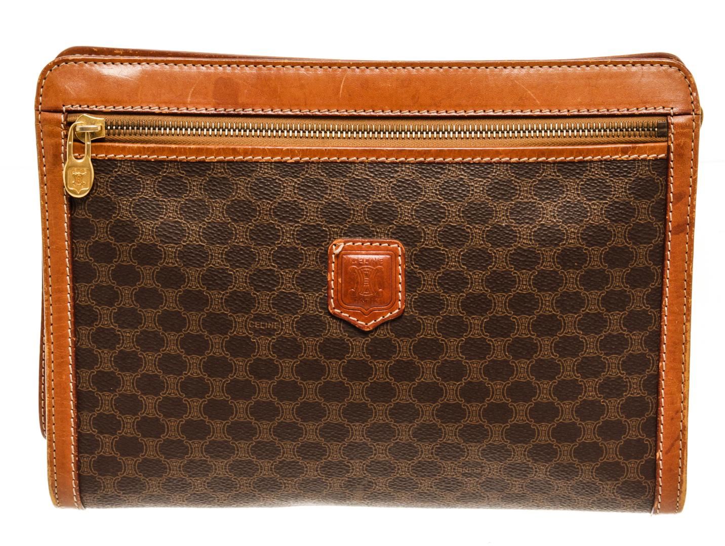 One Celine Macadam Men Clutch. Item is sold AS-IS. All available information is listed in the description and shown in the photo. Celine Macadam men clutch with contrasting trim, zipper closure, one exterior zip pocket, one interior zip pocket, and gold-toned hardware.