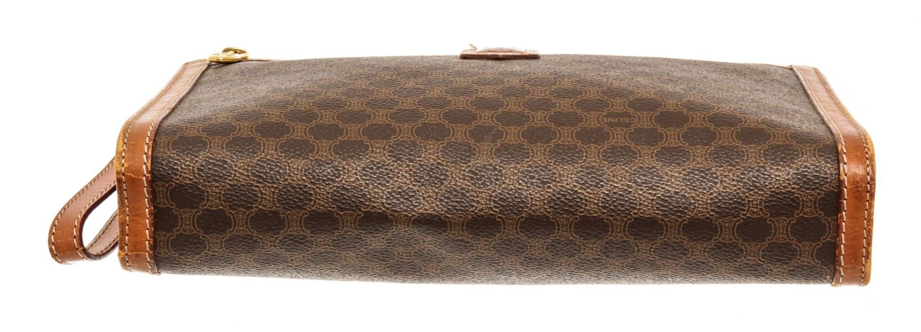 One Celine Macadam Men Clutch. Item is sold AS-IS. All available information is listed in the description and shown in the photo. Celine Macadam men clutch with contrasting trim, zipper closure, one exterior zip pocket, one interior zip pocket, and gold-toned hardware.