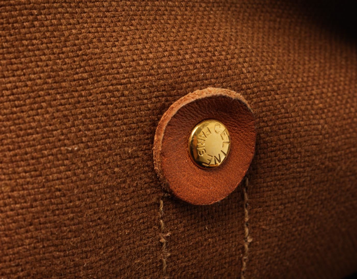 One Celine Macadam Pattern Logo Embossed Big Boston Bag Brown. Item is sold AS-IS. All available information is listed in the description and shown in the photo. Celine Macadam Pattern Logo Embossed Big Boston Bag Brown with top handle, gold tone hardware and zipper closure. Bottom of bag is very worn and stained, white mark towards the bottom of the bag. Please refer to photos.
