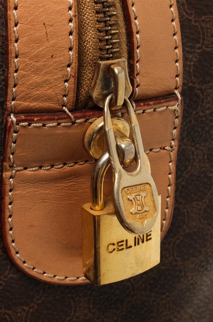 One Celine Macadam Pattern Logo Embossed Big Boston Bag Brown. Item is sold AS-IS. All available information is listed in the description and shown in the photo. Celine Macadam Pattern Logo Embossed Big Boston Bag Brown with top handle, gold tone hardware and zipper closure. Bottom of bag is very worn and stained, white mark towards the bottom of the bag. Please refer to photos.