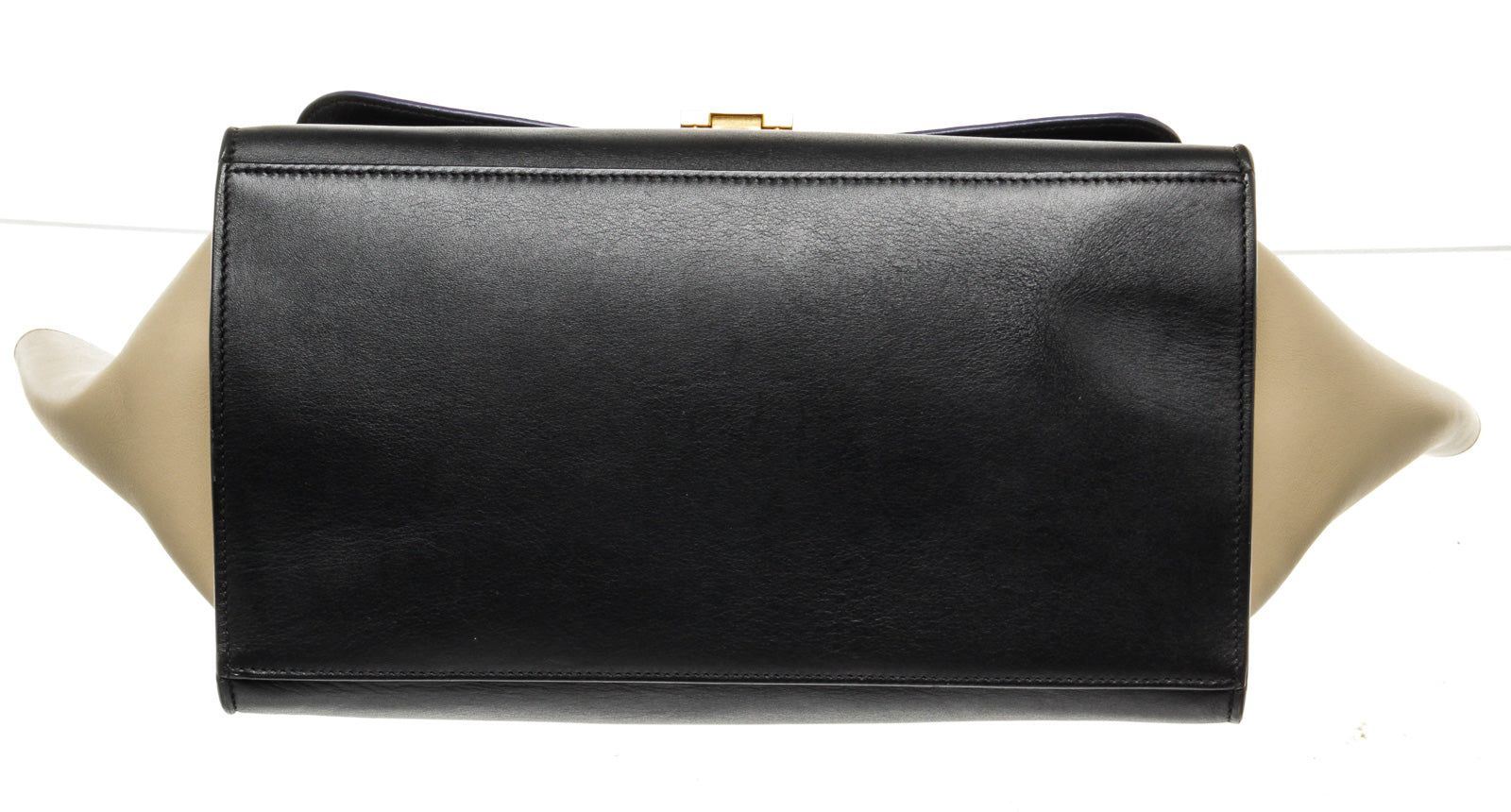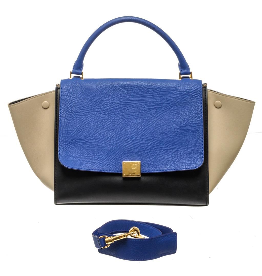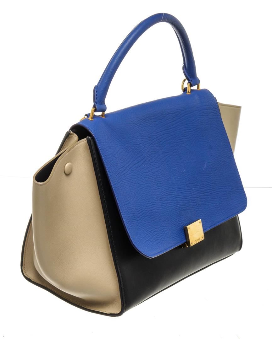 Celine Multicolor Leather Calfskin Suede Trapeze Handbag with leather, gold-tone hardware, interior slip pockets, top handle and zipper closure.