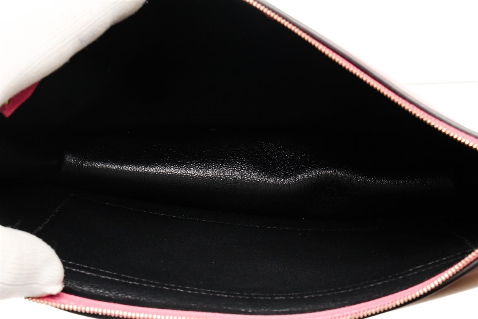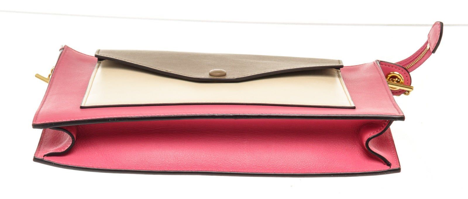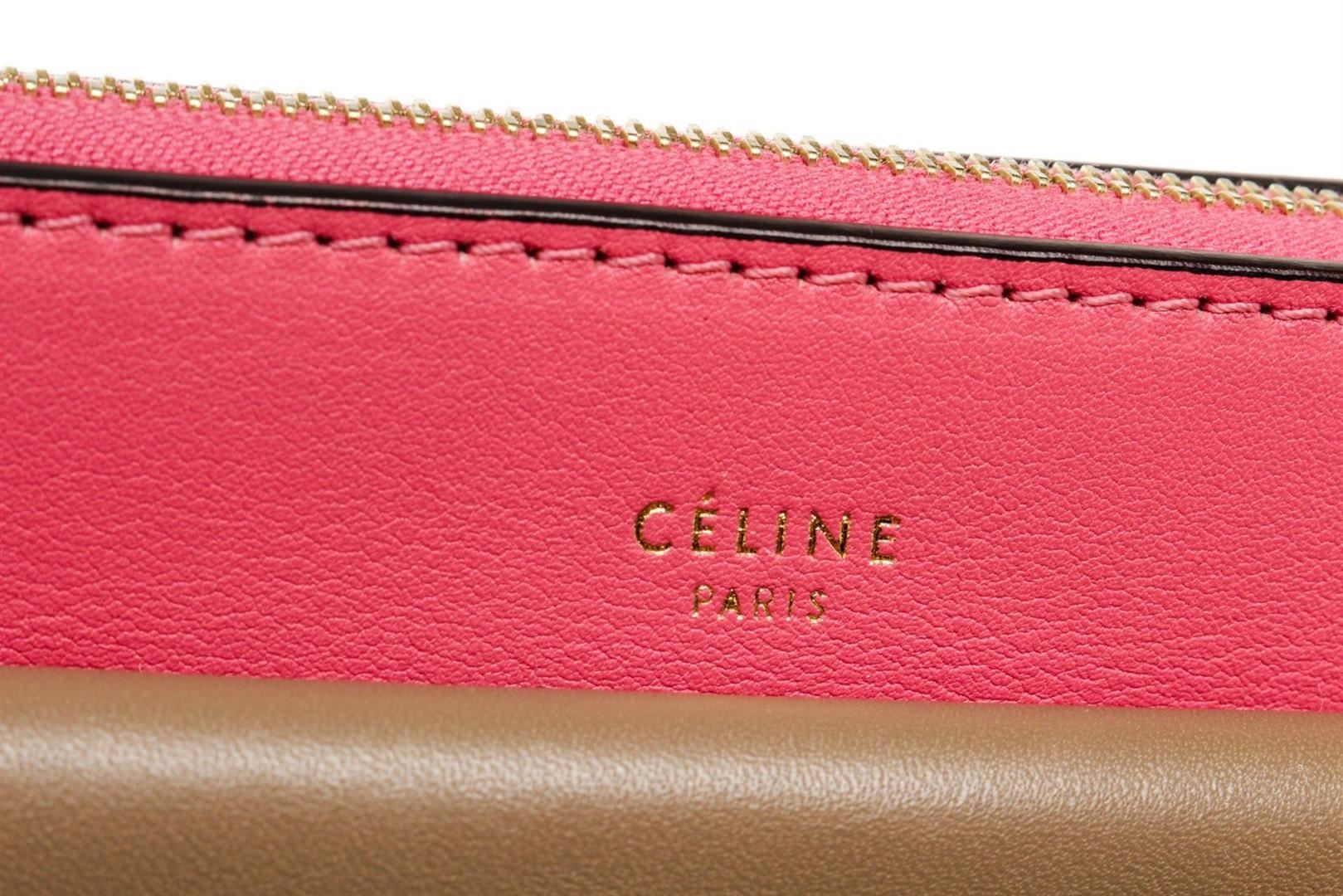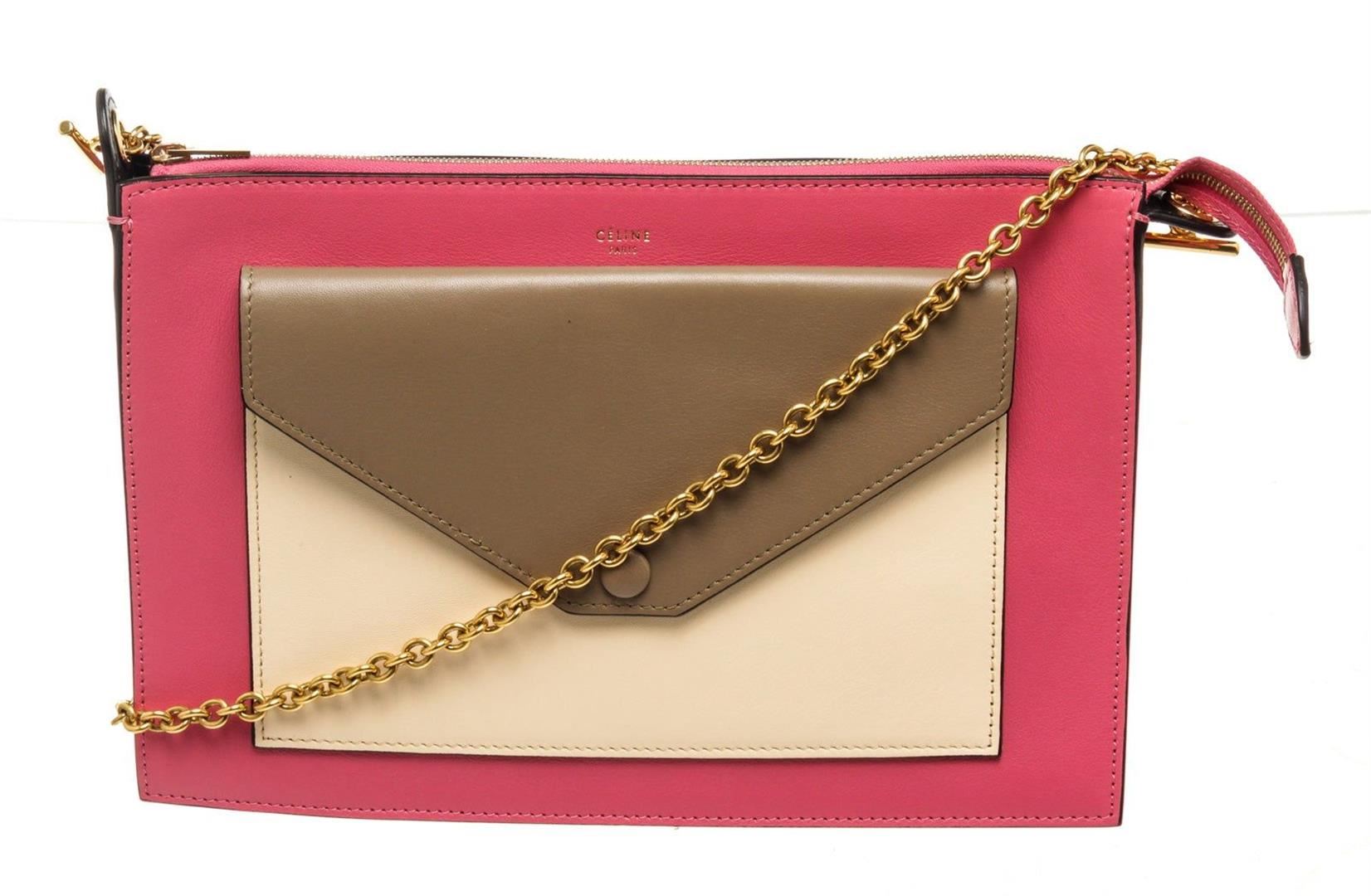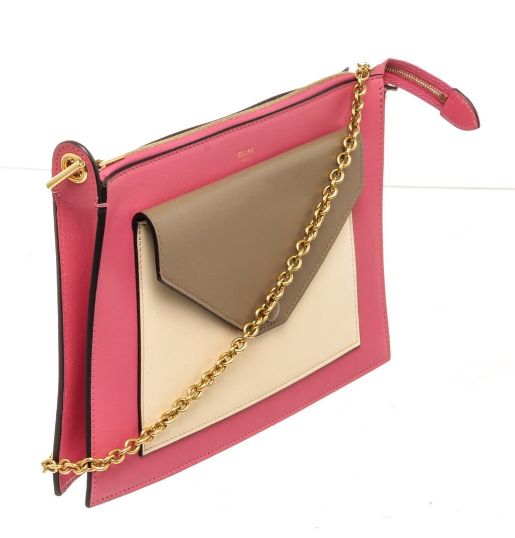 Celine Multicolor Leather Pocket Clutch Bag with leather, gold-tone hardware, trim leather, exterior slip pocket, and zipper closure.