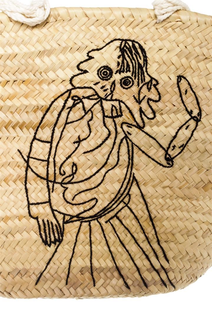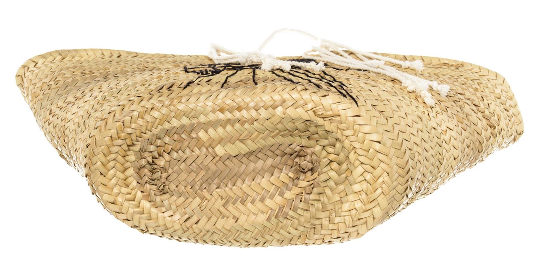 Neutral/beige embroidered straw Celine Classic Panier bucket bag with dual white canvas shoulder straps, fringe detailing, embroidered front and logo stamp in black leather inside. 11"L x 6.5"W x 13"H, Handle Drop 13"