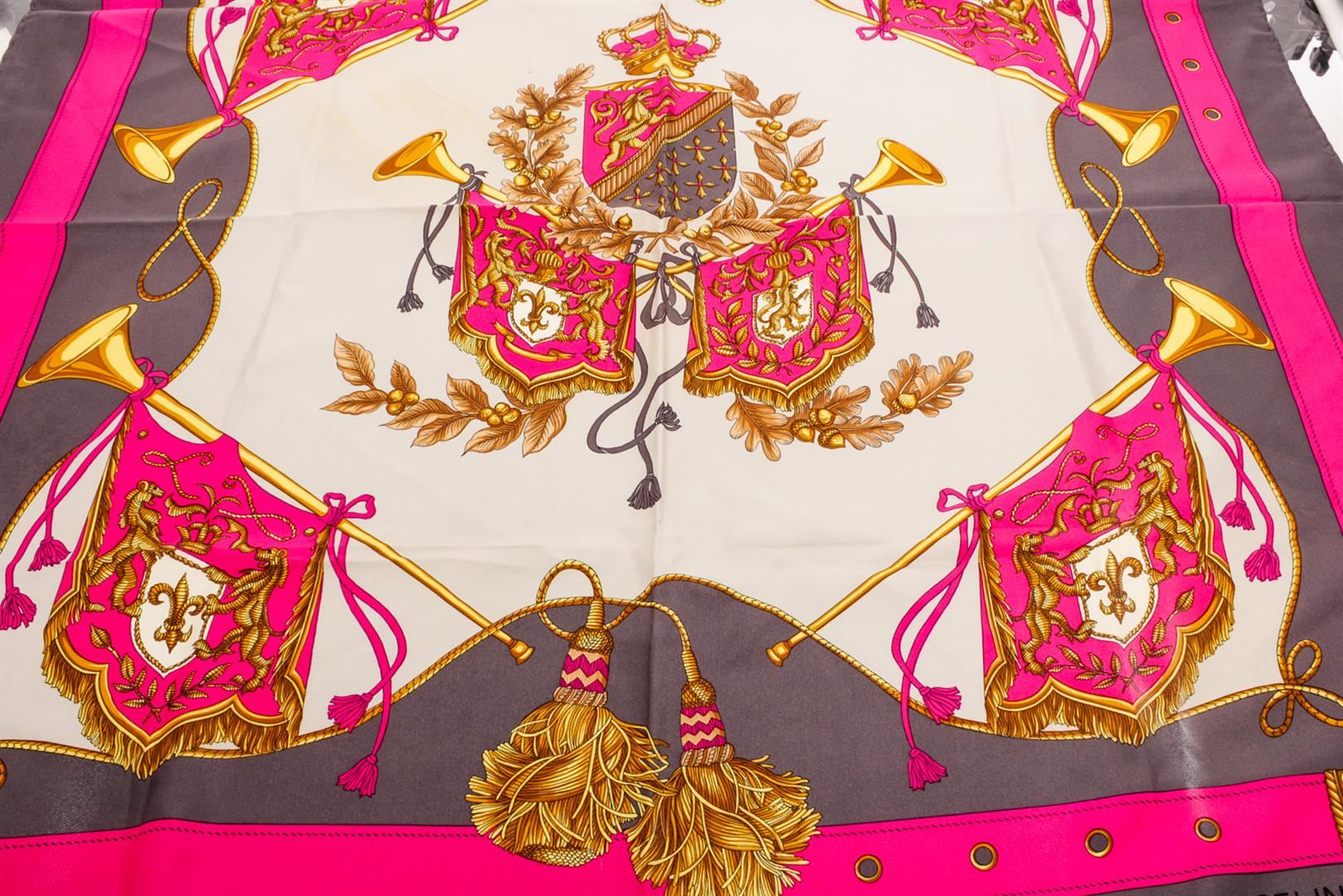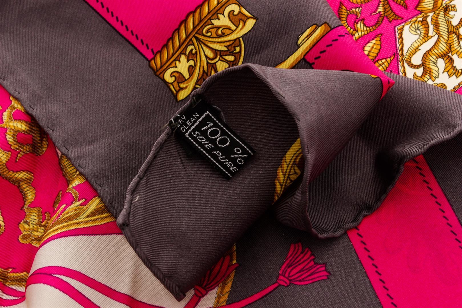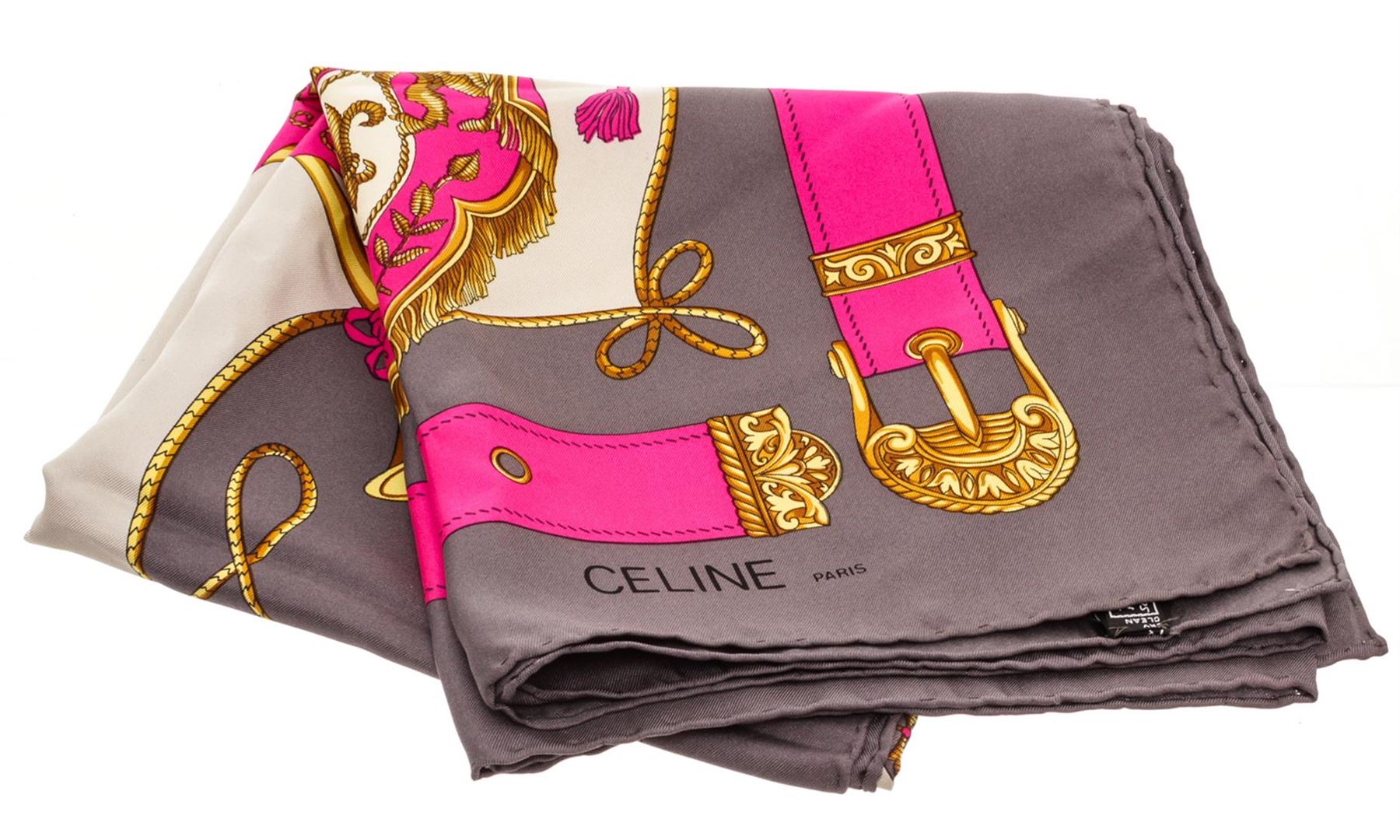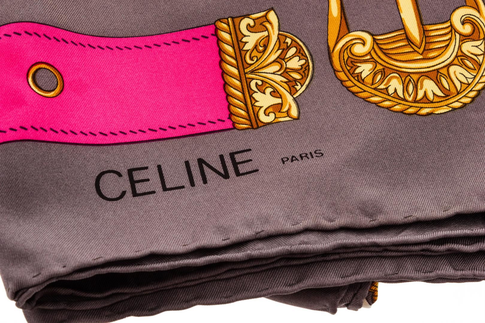 Celine pink gray gold silk scarf with royal crest illustration.