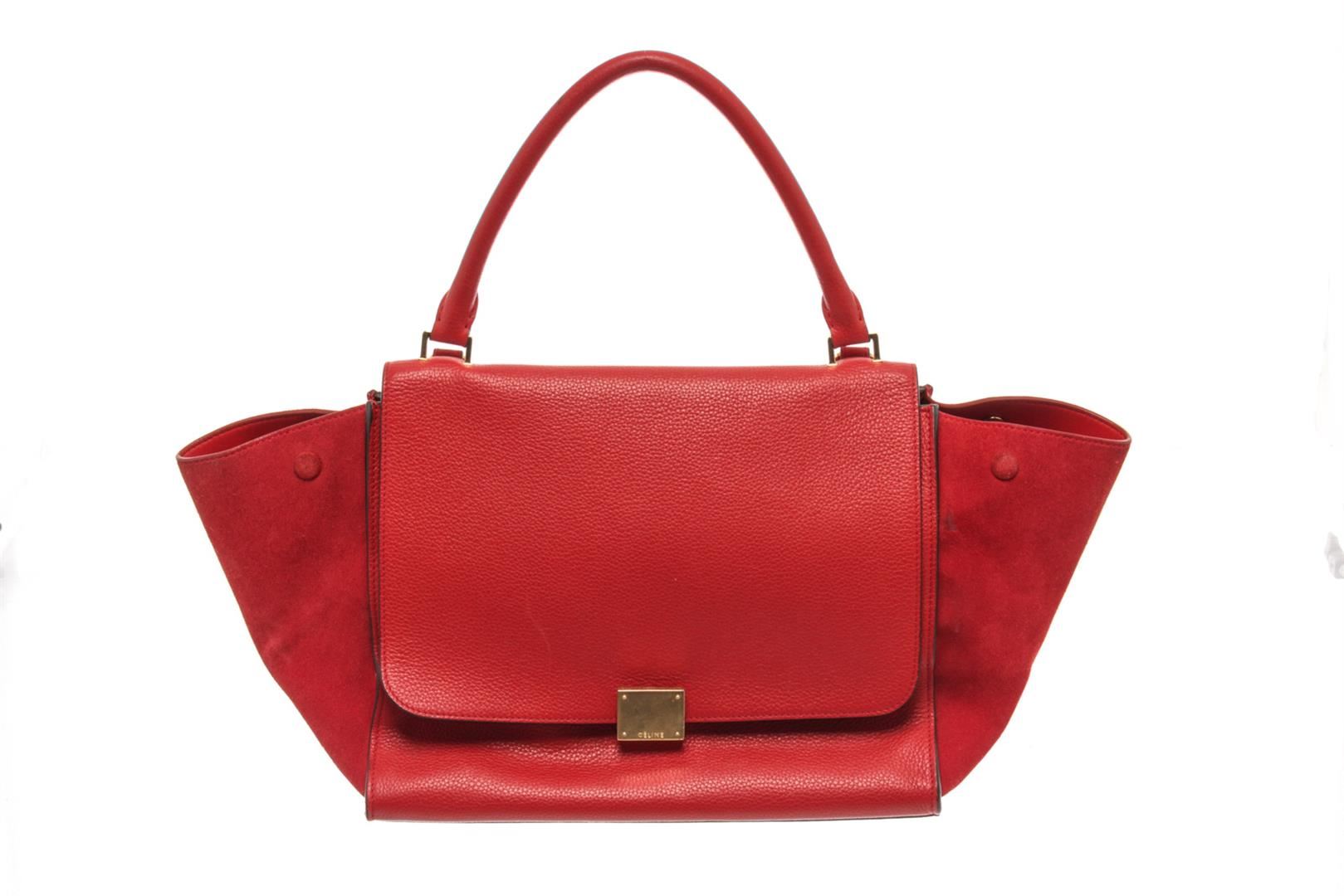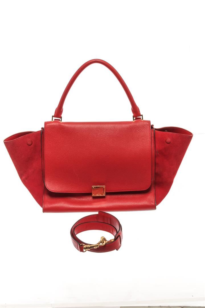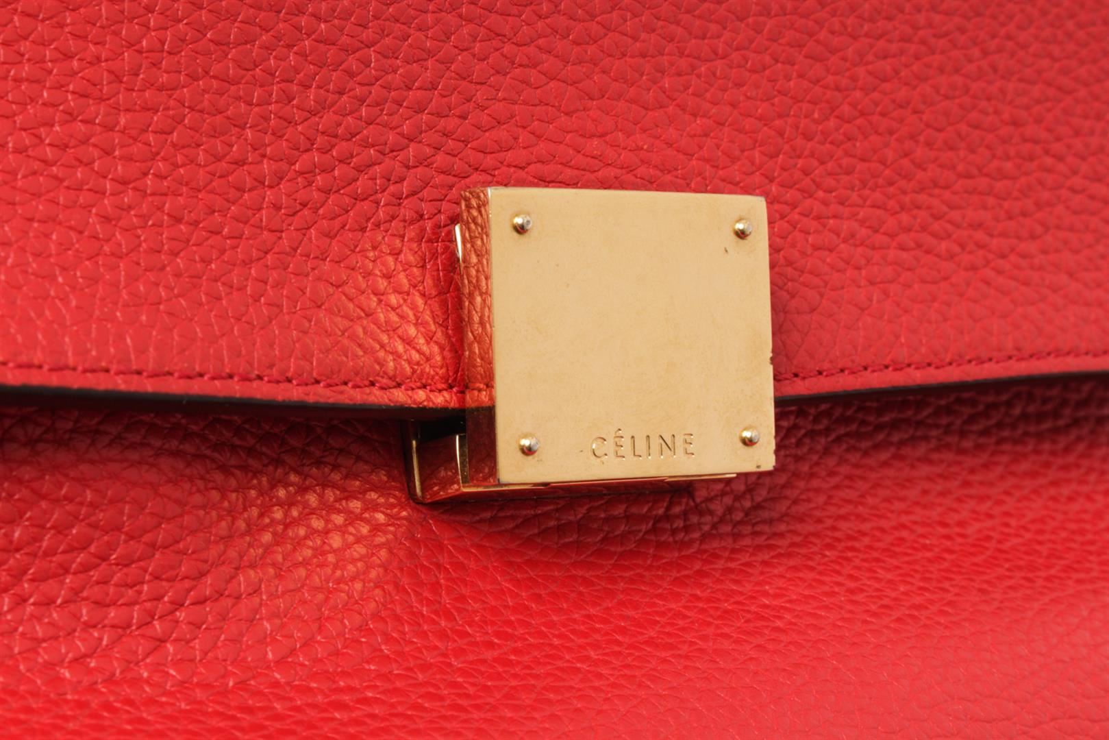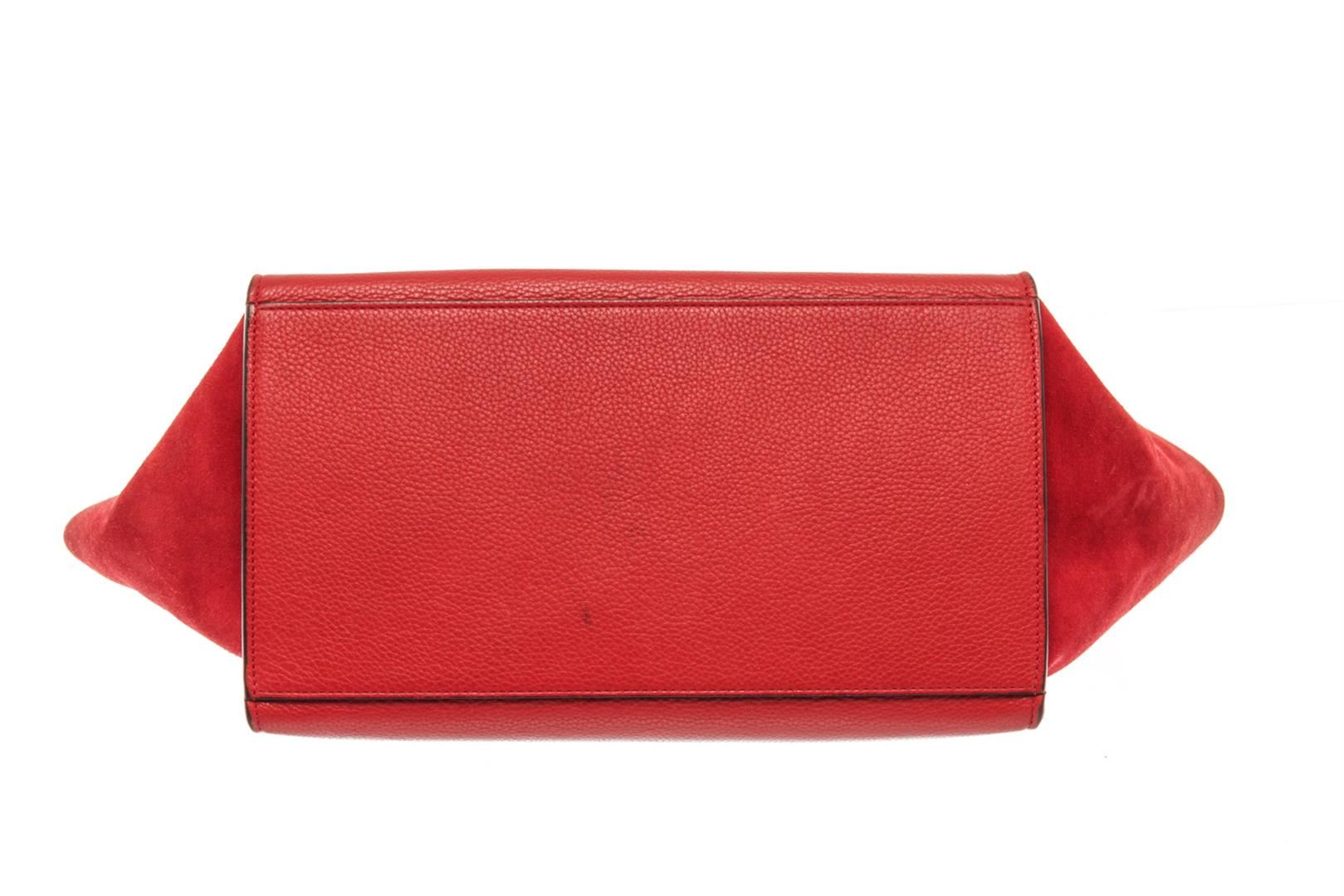 Celine Red Leather Medium Trapeze Shoulder Bag. All available information is listed in the description and shown in the photos. Celine Red Leather Medium Trapeze Shoulder Bag with red leather, gold-tone hardware, suede trim, rolled handle & single shoulder strap, leather lining & dual interior pockets, turn-lock closure at front. Height: 10", Width: 20", Depth: 7" / 25.4 x 50.8 x 17.78 CM