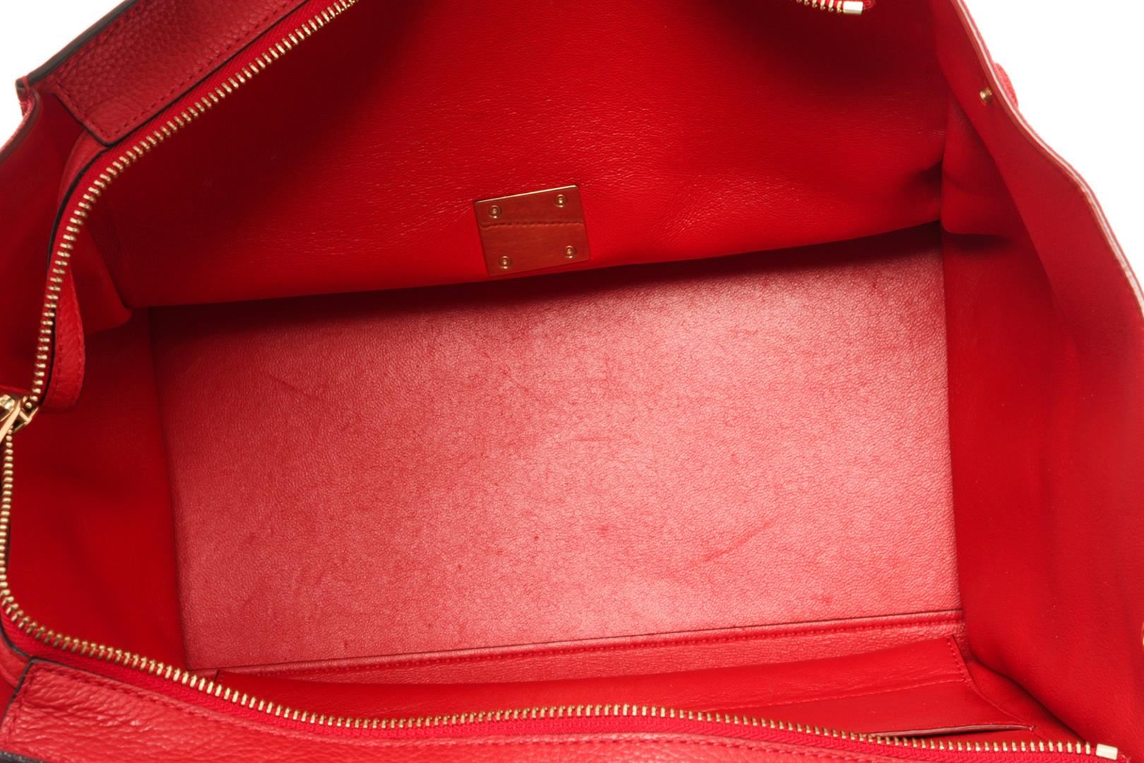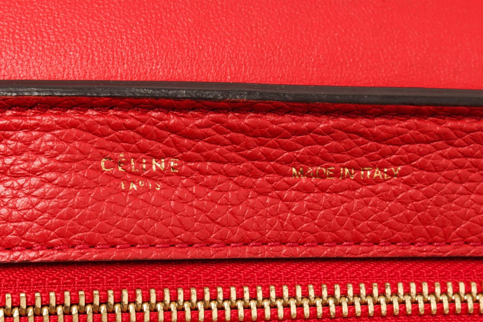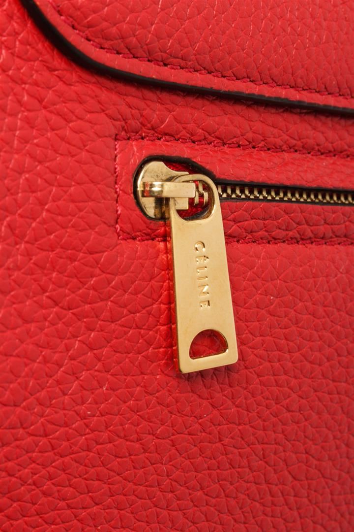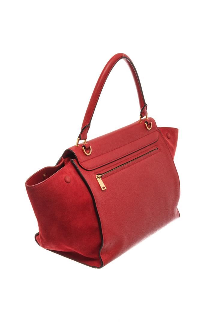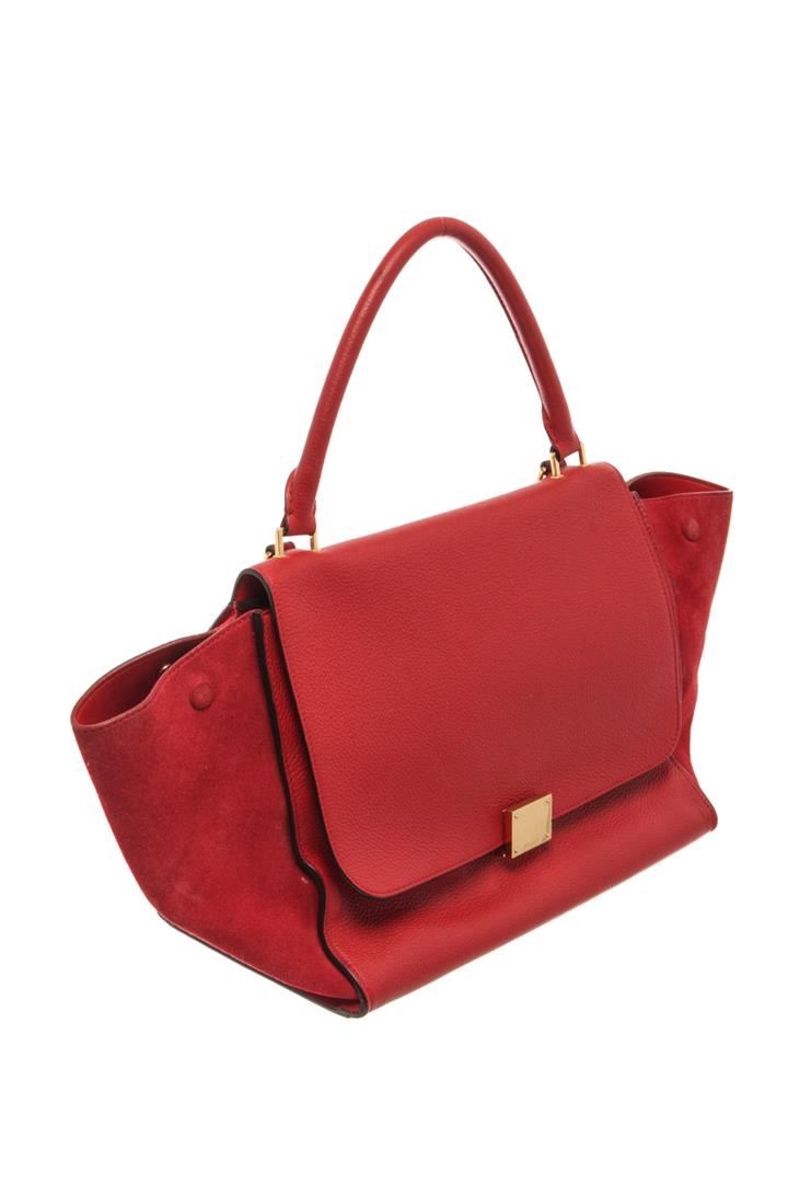Celine Red Leather Medium Trapeze Shoulder Bag. All available information is listed in the description and shown in the photos. Celine Red Leather Medium Trapeze Shoulder Bag with red leather, gold-tone hardware, suede trim, rolled handle & single shoulder strap, leather lining & dual interior pockets, turn-lock closure at front. Height: 10", Width: 20", Depth: 7" / 25.4 x 50.8 x 17.78 CM