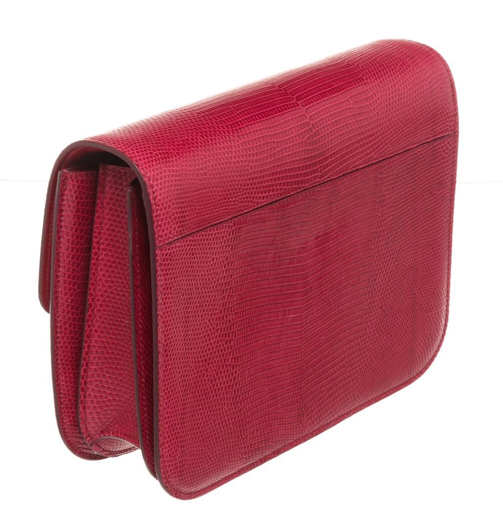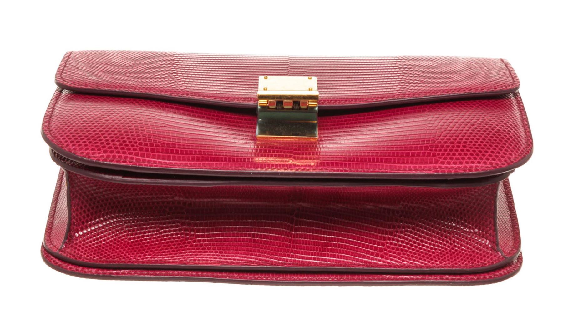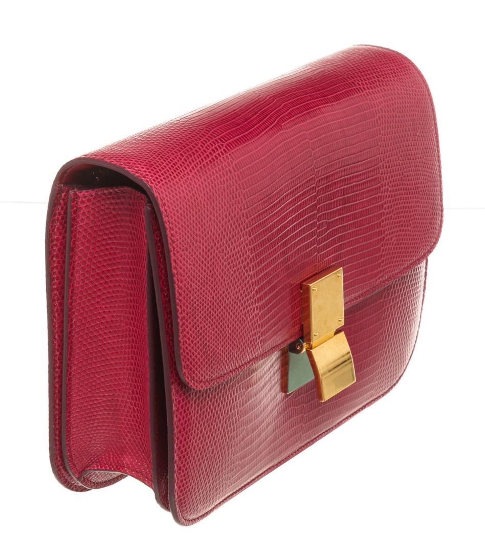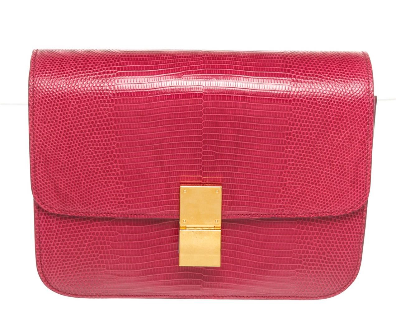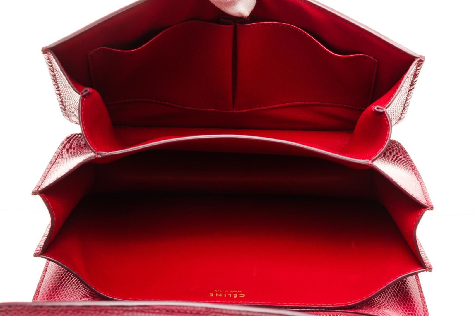Celine Red Lizard Skin Leather Medium Box Shoulder Bag with silver-tone hardware, single flat top handle, brown leather trim, flip-lock closure at front
