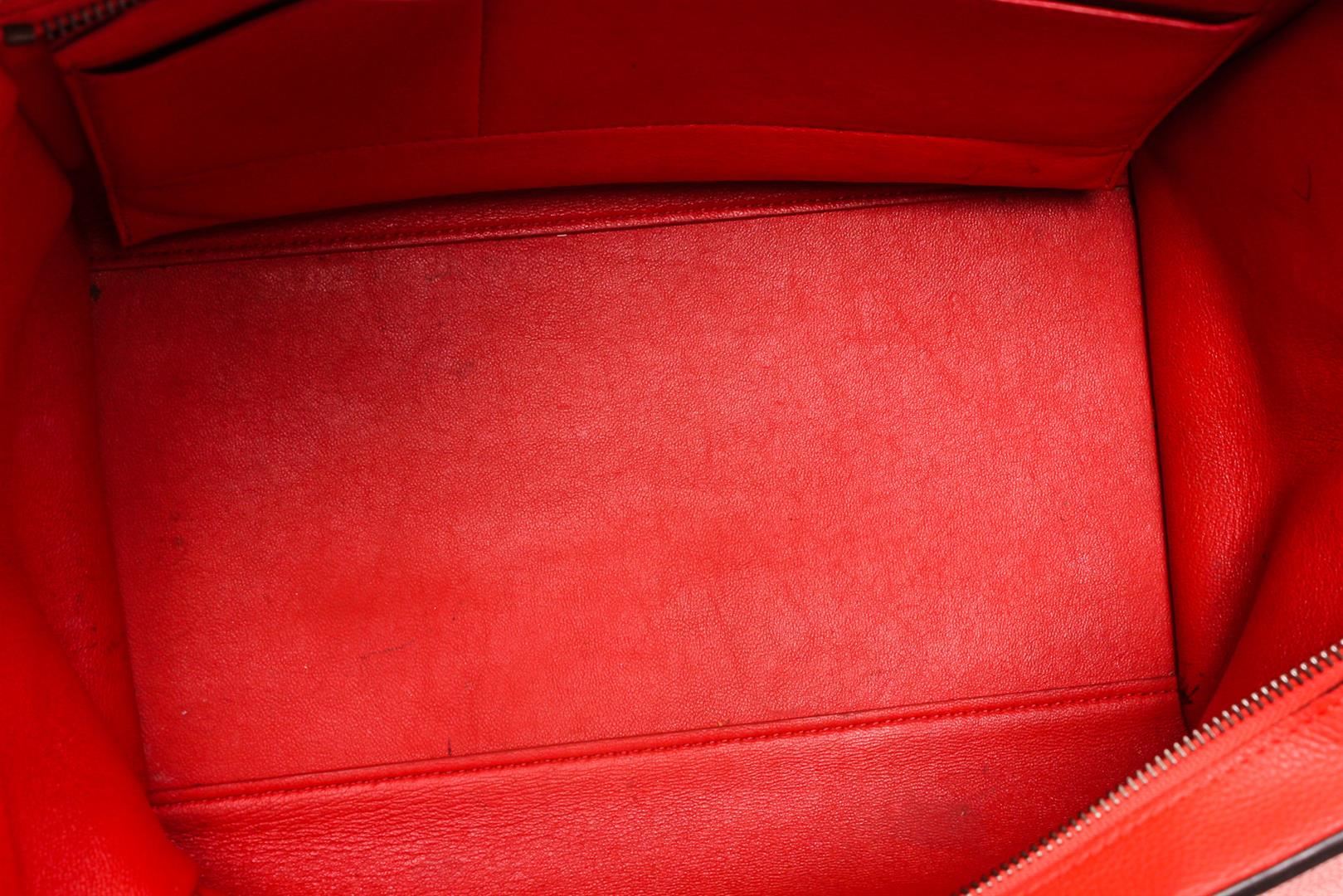 Red leather Céline Small Trapeze Bag with silver-tone hardware, single rolled top handle, detachable flat shoulder strap, dual side gussets with snap expansions at sides, exterior zip pocket at back, tonal leather lining, dual interior slit pockets and flip-lock closure at front flap.
