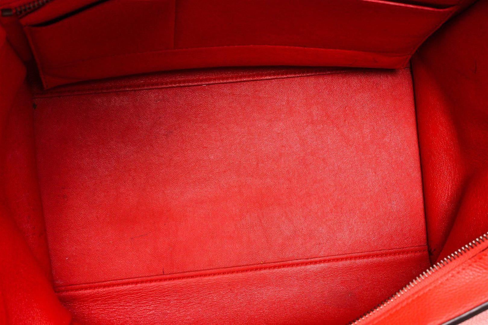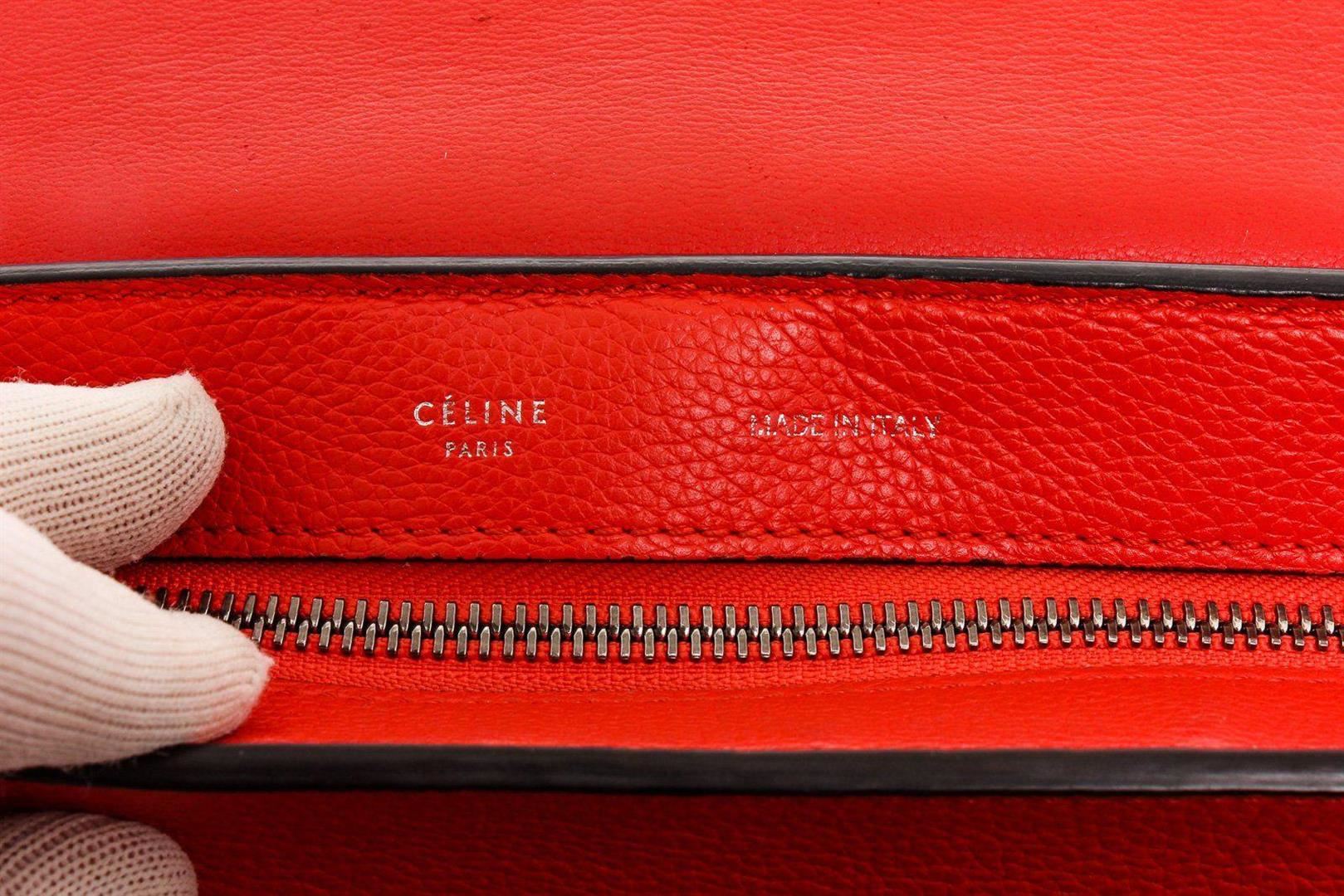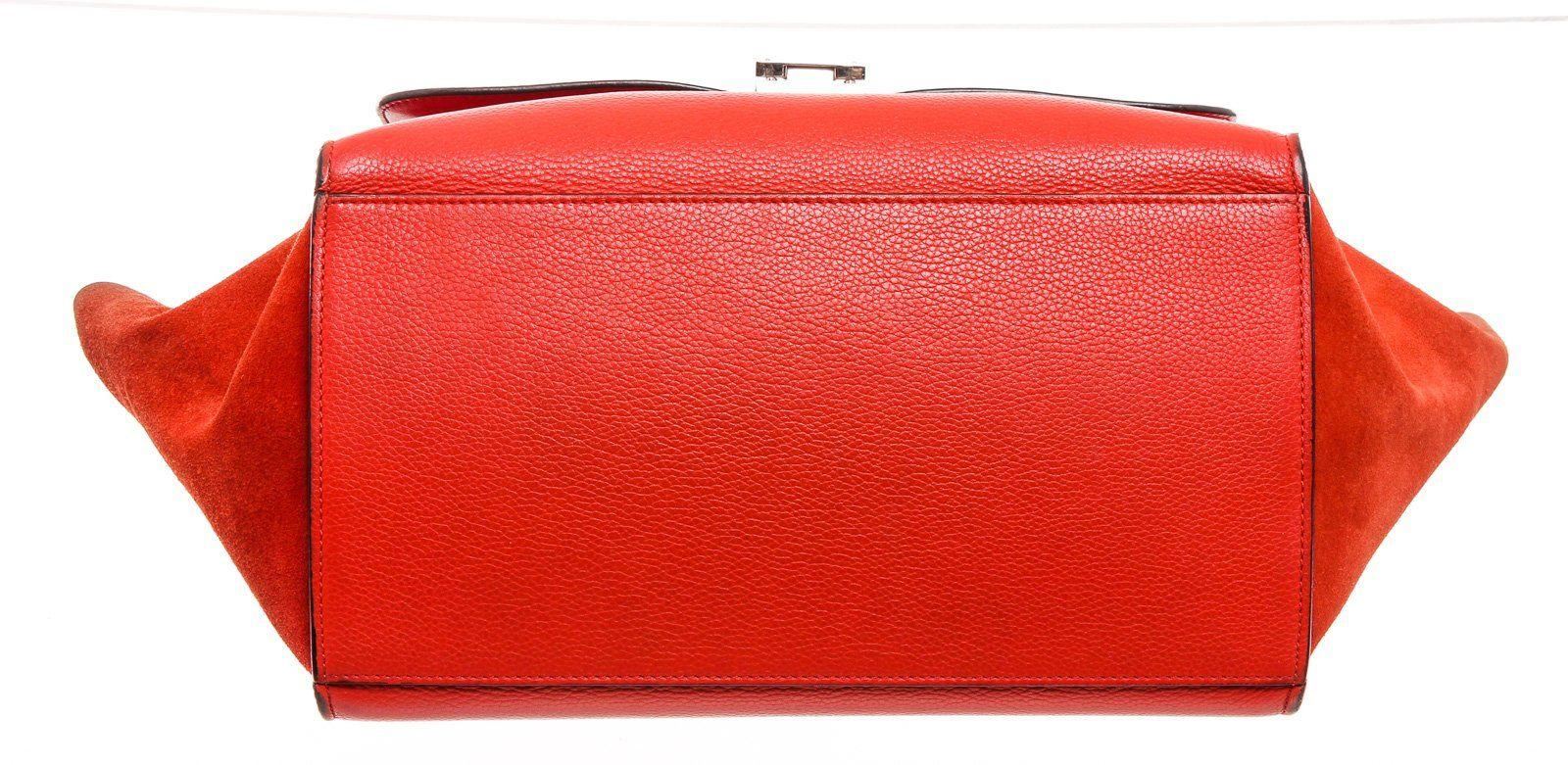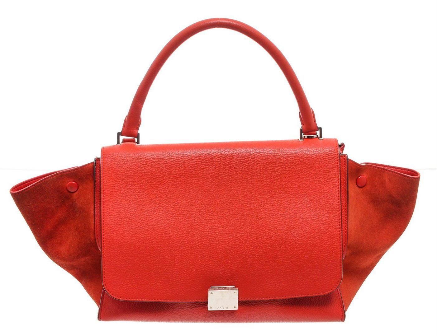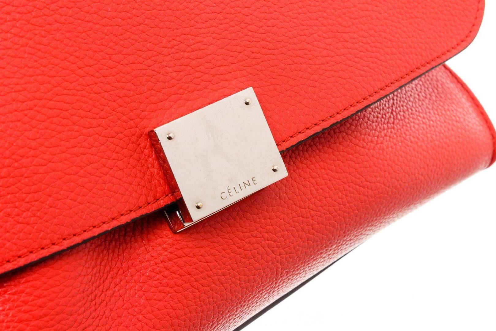 Red leather Celine Small Trapeze Bag with silver-tone hardware, single rolled top handle, detachable flat shoulder strap, dual side gussets with snap expansions at sides, exterior zip pocket at back, tonal leather lining, dual interior slit pockets and flip-lock closure at front flap.