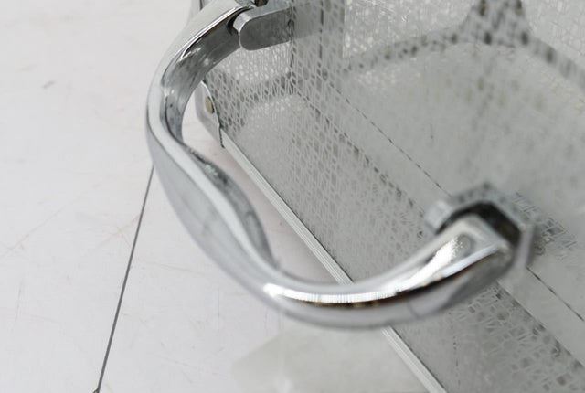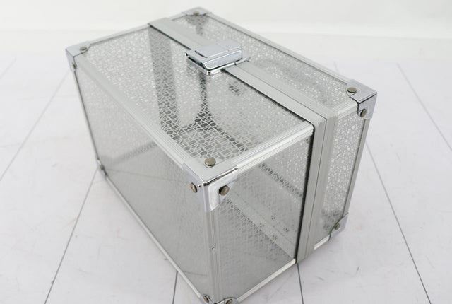 Celine cosmetic box features clear plastic body with repeated CELINE pattern, silver-tone hardware, single top handle and push-lock closure at front. .5"x5.5"x8.3"