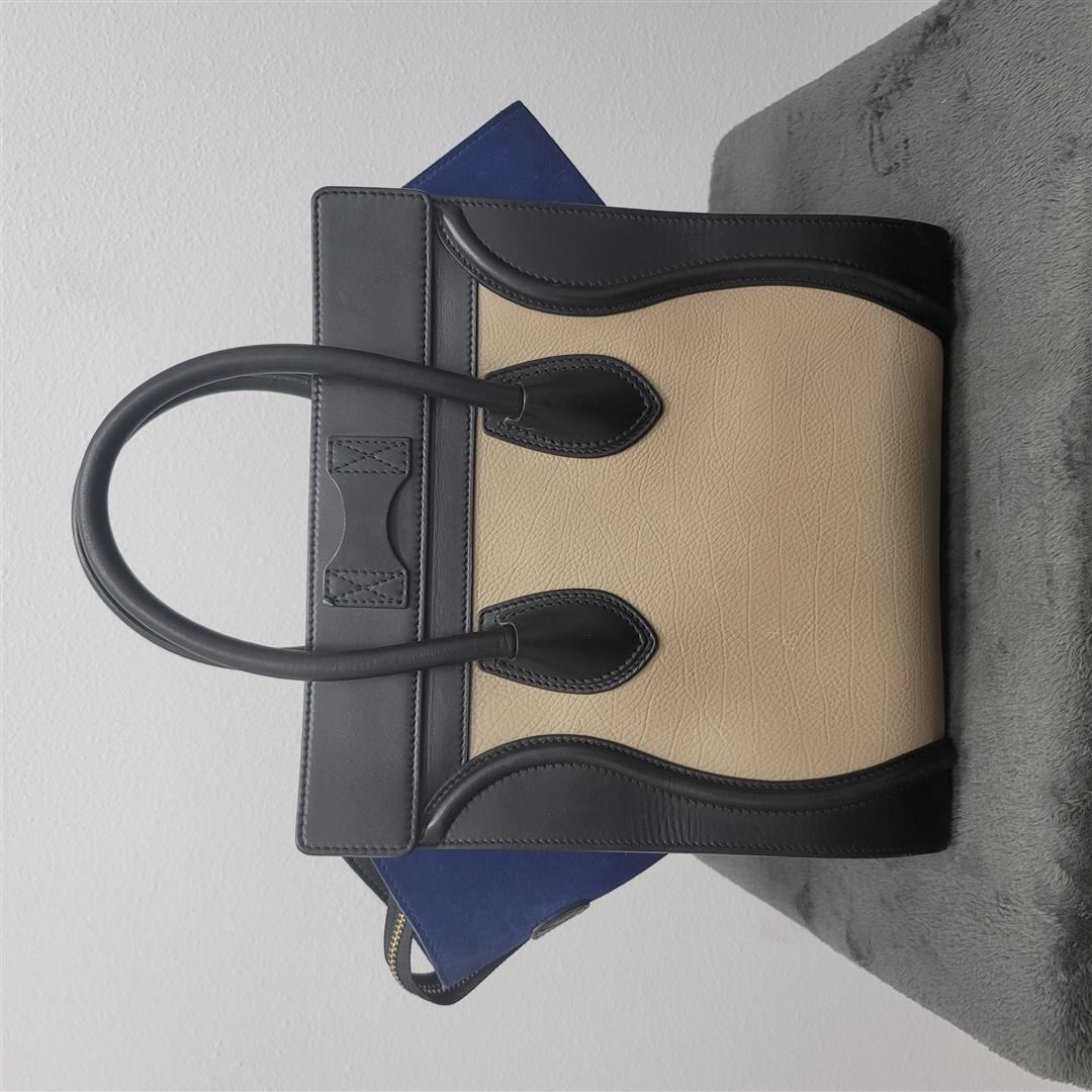 One Celine Tri-Color Leather Mini Luggage Tote Bag. The mini Luggage tote from Celine is one of the most popular handbags in the world. This tri-color tote is crafted from leather. It comes with rolled top handles, and a front zip pocket. The bag is equipped with a well-sized leather and nubuck interior for you to carry your essentials. Say hell to your new favourite handbag! Exterior material: Leather, Interior material: Leather and Nubuck, Hardware: Gold Tone, Production yearL 2014, Origin: Italy