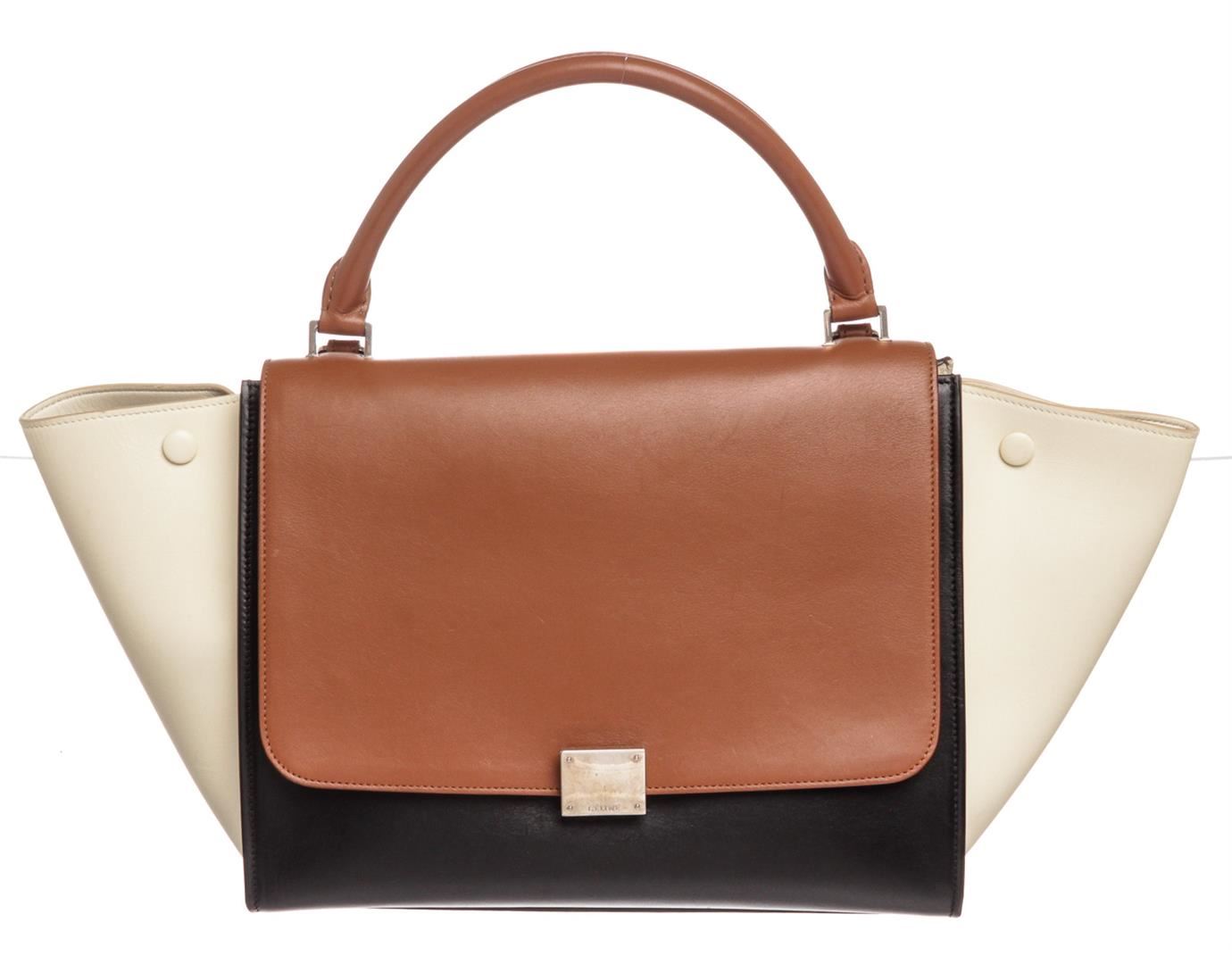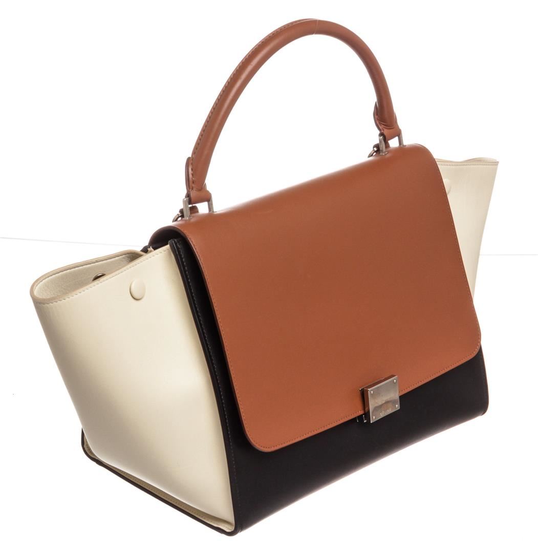 Black, brown and cream tricolor leather Celine Large Trapeze bag with gold-tone hardware, single rolled top handle, concealed front exterior zip pocket, cream lambskin leather interior lining, single pocket at interior wall, snap closures at sides and flip and turn-lock closure at front flap. Authentic.