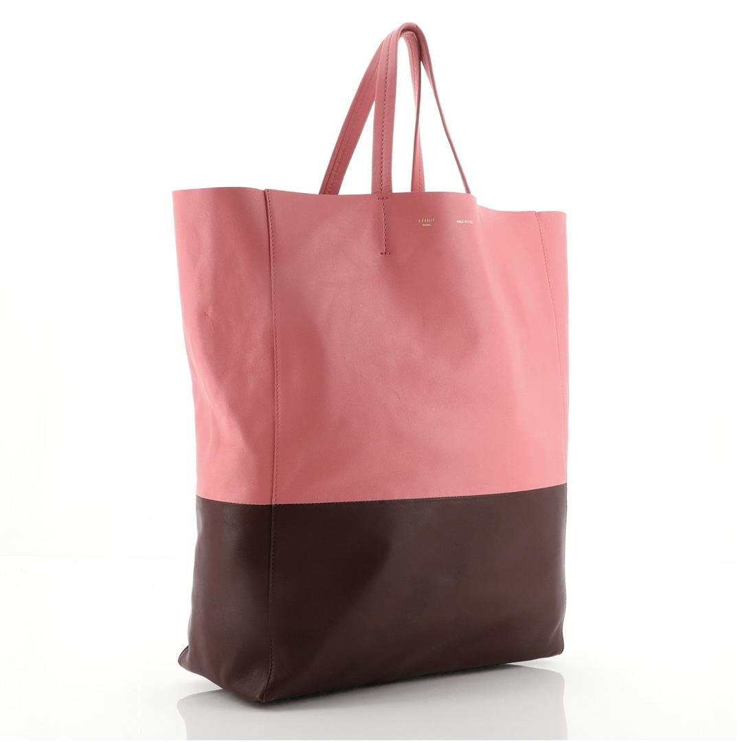Celine Vertical Bi-Cabas Tote Leather Large Pink Red Leather Condition Details: Moderate wear on base corners, creasing scuffs and small marks on exterior. Wear and small glue stains on handles, wear in interior, scratches on hardware. eight 17", W