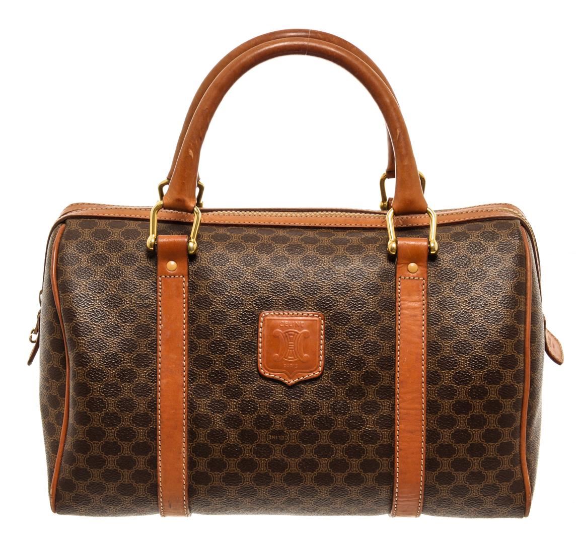 One Celine Vintage Boston Bag Macadam. Item is sold AS-IS. All available information is listed in the description and shown in the photo. Celine vintage Boston Bag Macadam with Macadam coated canvas exterior, gold-tone hardware, brown leather lining, zip closure, and top handles.