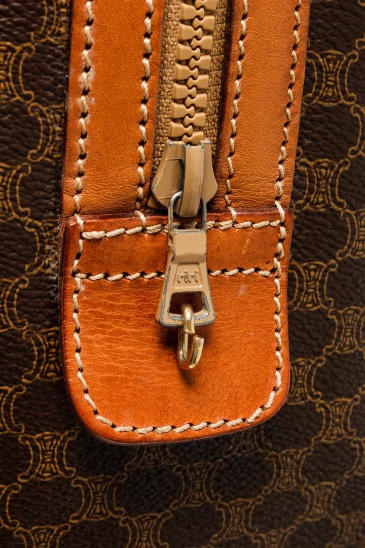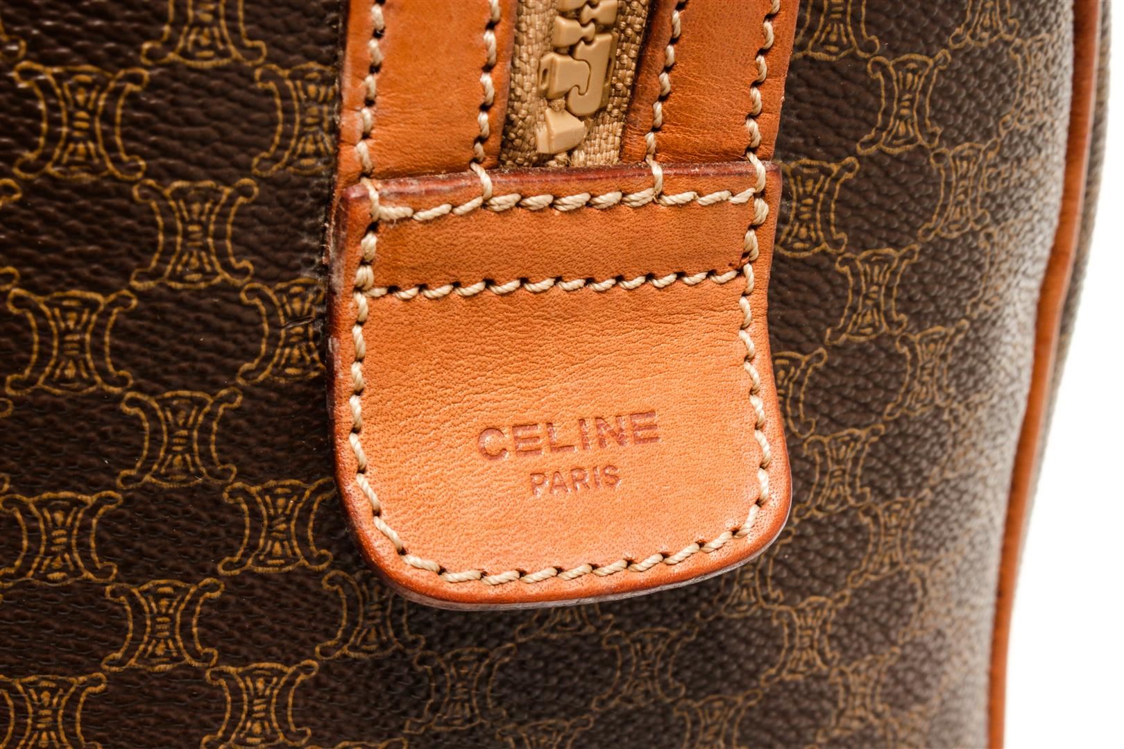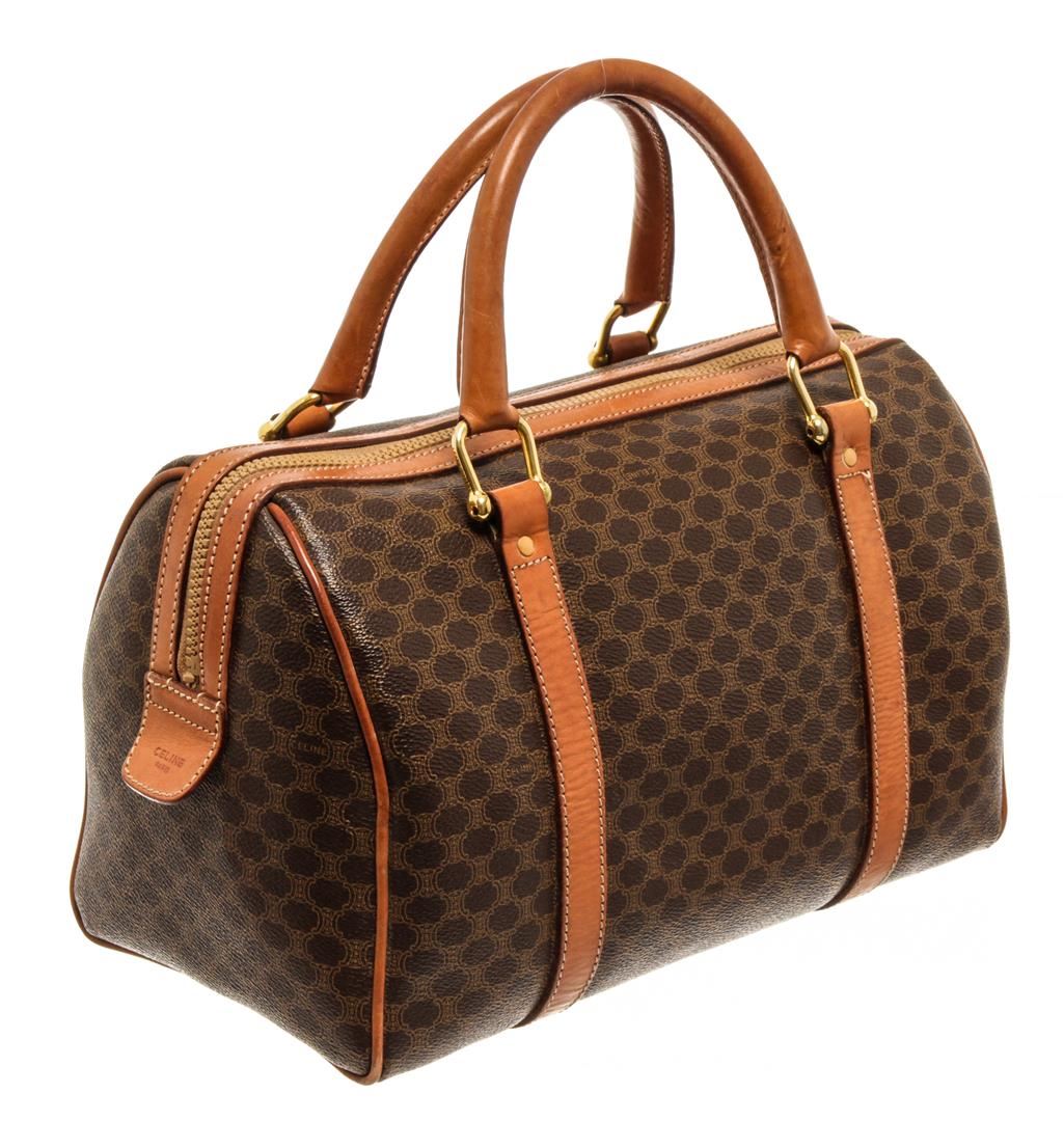 One Celine Vintage Boston Bag Macadam. Item is sold AS-IS. All available information is listed in the description and shown in the photo. Celine vintage Boston Bag Macadam with Macadam coated canvas exterior, gold-tone hardware, brown leather lining, zip closure, and top handles.