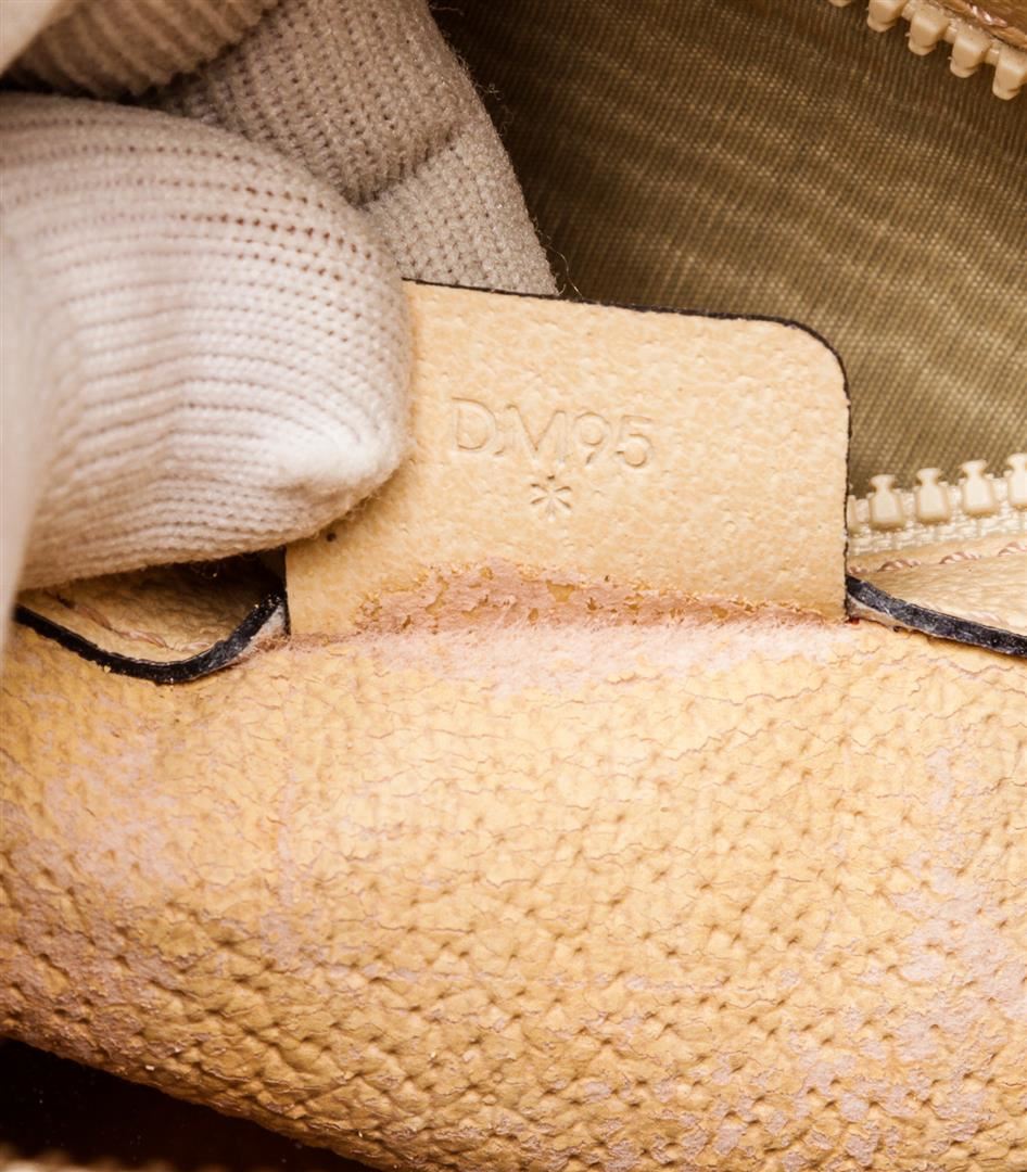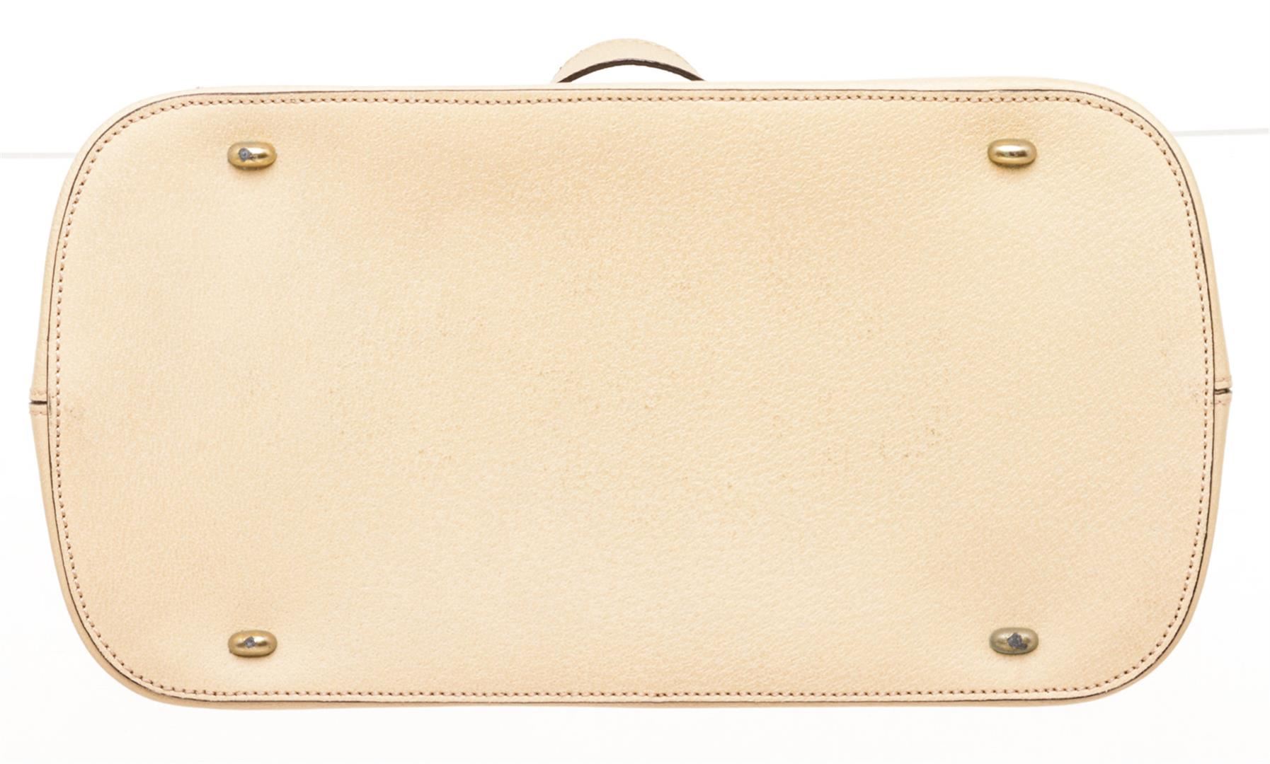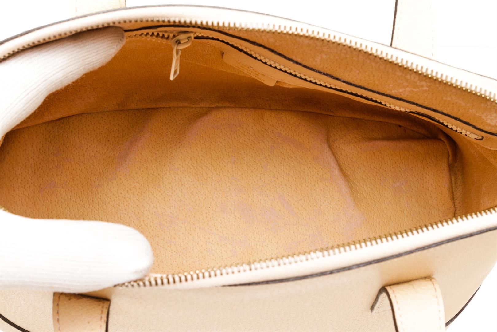 One Celine Vintage Cream Textured Leather Tote Shoulder Bag. Cream textured leather Celine Vintage tote shoulder bag with gold-tone hardware, detachable flat leather shoulder strap, dual flat top handles, tonal suede lining, two interior pockets; one with zipper closure and overall zip closure.