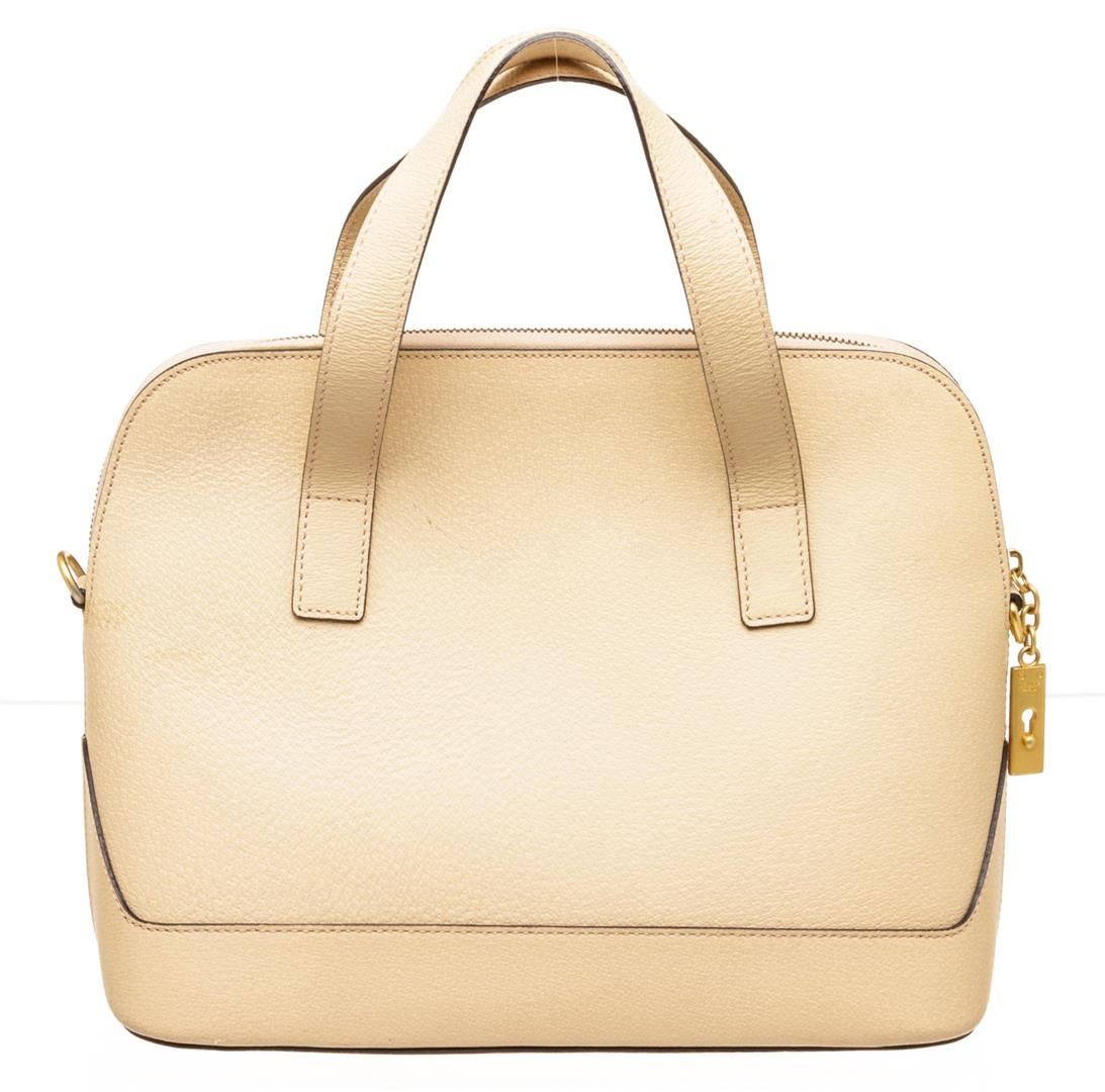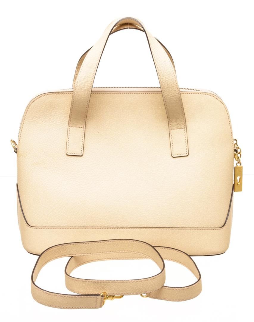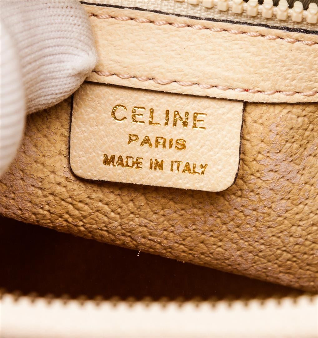 One Celine Vintage Cream Textured Leather Tote Shoulder Bag. Cream textured leather Celine Vintage tote shoulder bag with gold-tone hardware, detachable flat leather shoulder strap, dual flat top handles, tonal suede lining, two interior pockets; one with zipper closure and overall zip closure.