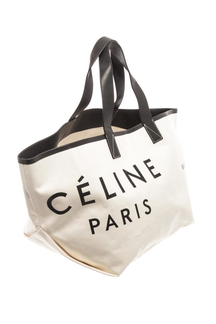Celine White Canvas with Leather Medium Logo Tote Bag. All available information is listed in the description and shown in the photos. Celine White Canvas with Leather Medium Logo Tote Bag with black matte leather trim and tall flat black leather shoulder straps making this bag a beautifully simple design, The top is open to a white interior, open top. Height: 33.02 cm (13 in), Width: 36.83 cm (14.5 in), Depth: 30.48 cm (12 in)