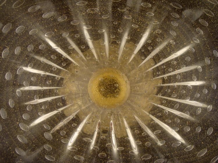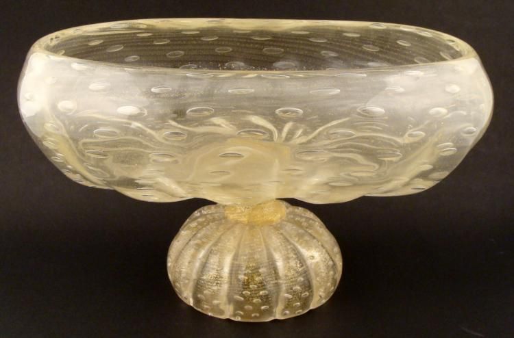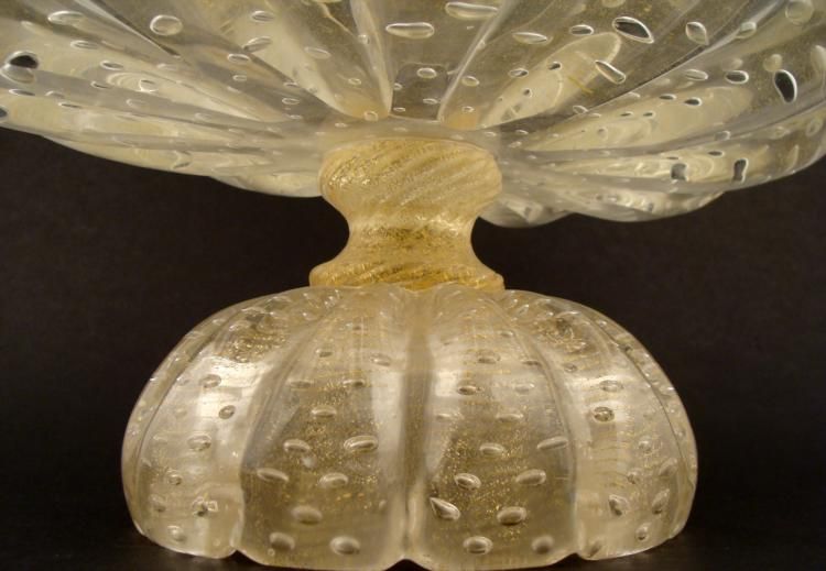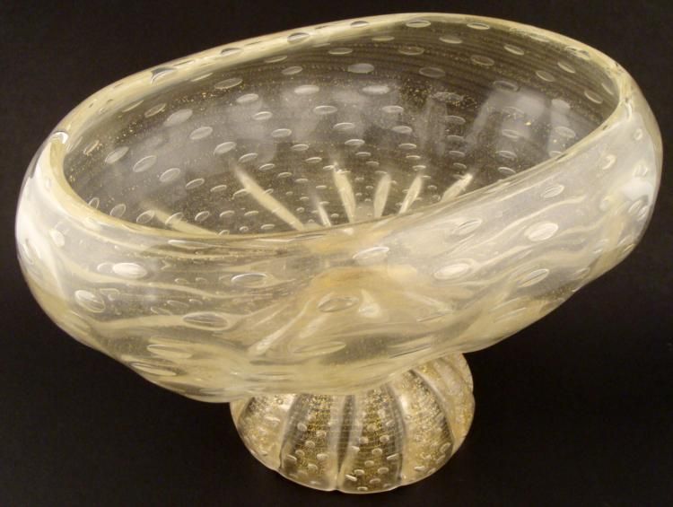 This is a hollow, hand-blown Venetian glass vessel with gold leaf detail. This beautiful piece of art glass features a swirling array of elongated bubbles that get larger toward the outer portion of the rim. The bowl is fluted underneath, creating a sun-ray pattern inside. Under the bowl is a twist style stem, and outward fluted base. The clear glass is all flecked with gold. * Name: CelliniDimensions: 9" tall, x 12" x 16"Condition: Excellent