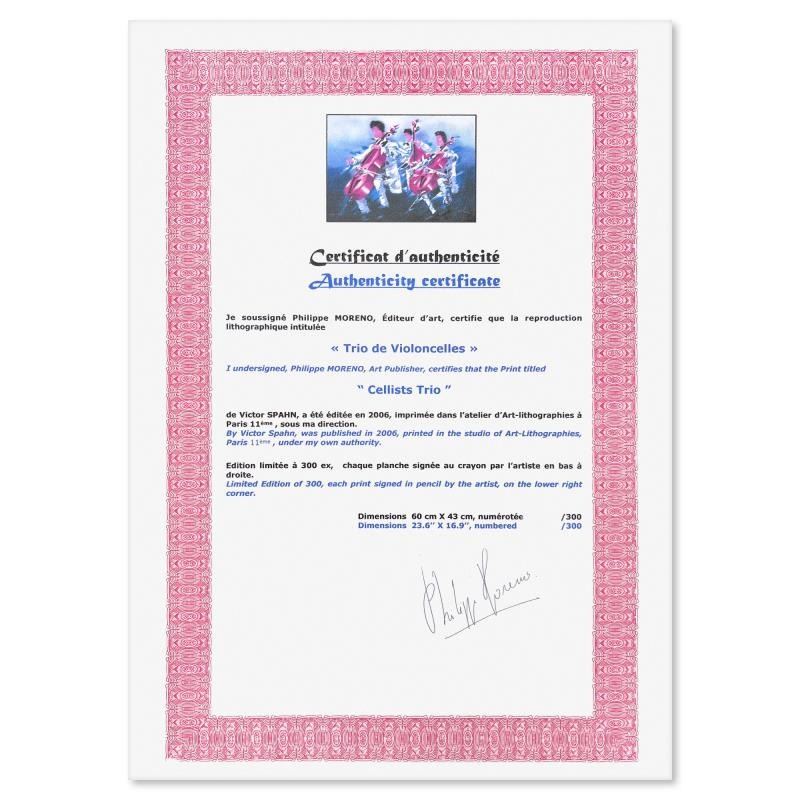 "Cellists Trio" is a limited edition lithograph on paper by Victor Spahn. Printed at Art-Lithographies workshop in Paris, the piece is hand signed by the artist and comes with a certificate of authenticity. Measures approximately 17" x 23.5" (image).