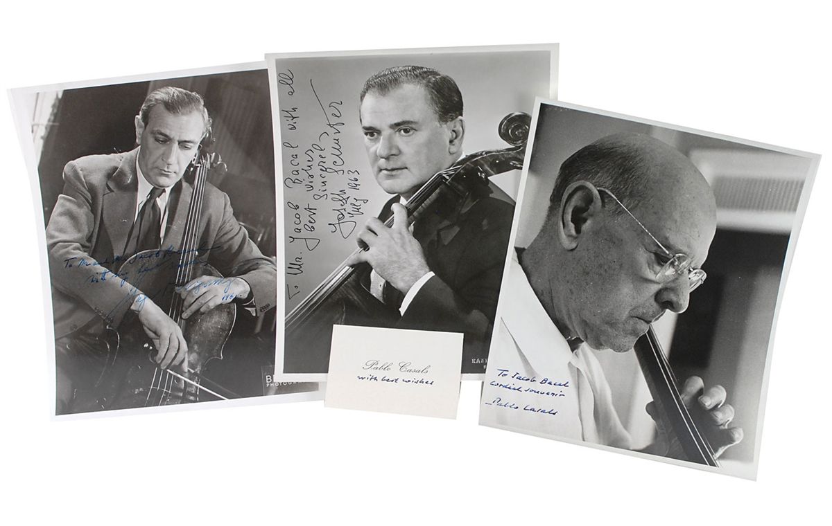 Collection of three vintage glossy 8 x 10 photos, each signed and inscribed in fountain pen by the cellist pictured. Signers are: Pablo Casals, Gregor Piatigorsky, and Joseph Schuster. In very good overall condition, with noticeable creases to the Piatigorsky photo. Accompanied by a Pablo Casals calling card with a sentiment written in Casal’s hand, “with best wishes.”