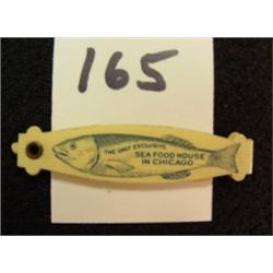 Celluloid advertising toothpicks. Hinged into fish. Picture with Chicago's "Ireland's Oyster House" name and address printed on one side and "The Only Exclusive Seafood House in Chicago" on the other. Length closed is 1-3/4". Very unusual. Condition: Excellent