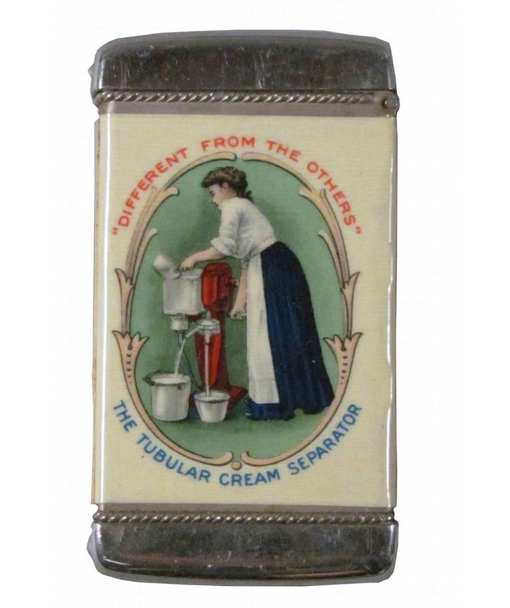 Celluloid Advertising Match Safe for Sharples Tubular Cream Separator. Product on front with factory scene on back. Excellent condition. 1 1/2 X 2 3/4 inches.