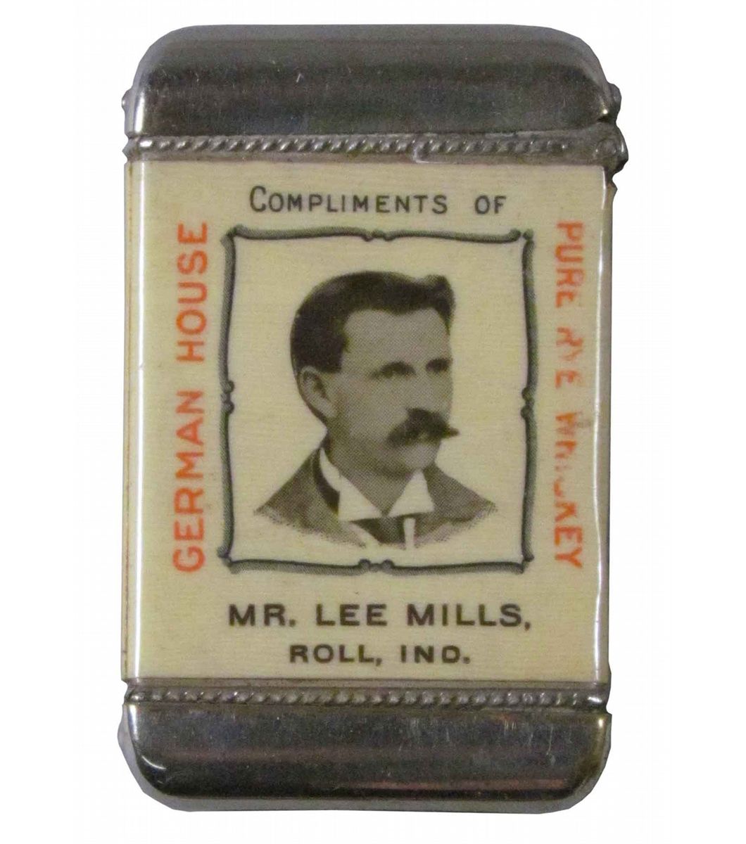 Celluloid Advertising Match Safe for German House Pure Rye Whiskey. Depicting Mr. Lee Mills, Roll, Ind. Some slight rubs otherwise very good condition. 1 3/8 X 2 1/4 inches.