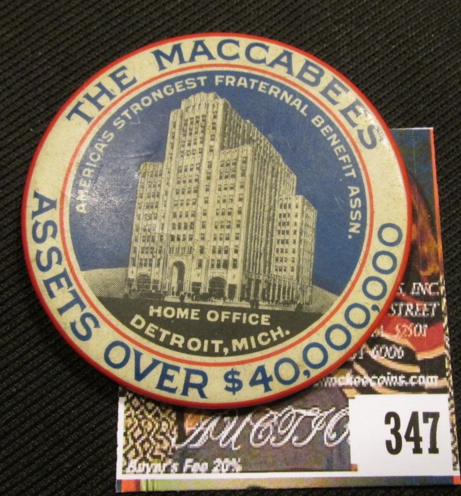 Celluloid Advertising Mirror "The Maccabees Assets over $40,000,000/America's Strongest Fraternal Benefit Assn./Home Office/Detroit, Mich."