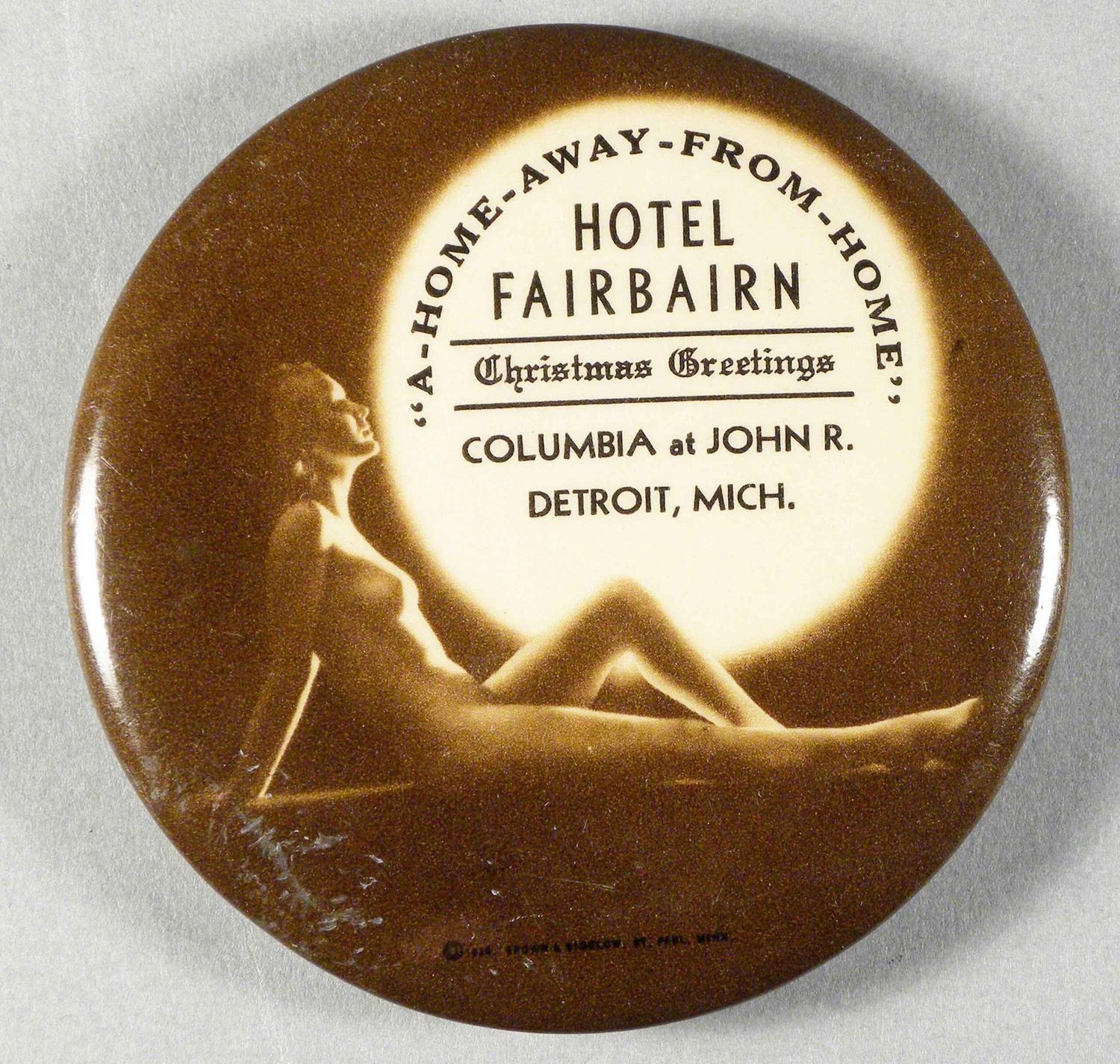 Celluloid Advertising Paper Weight and Mirror. Hotel Fairbairn, Detroit, MI. Depicting sepeatone nude image. Excellent condition. 3 1/2 inch diameter. Starting bid $40
