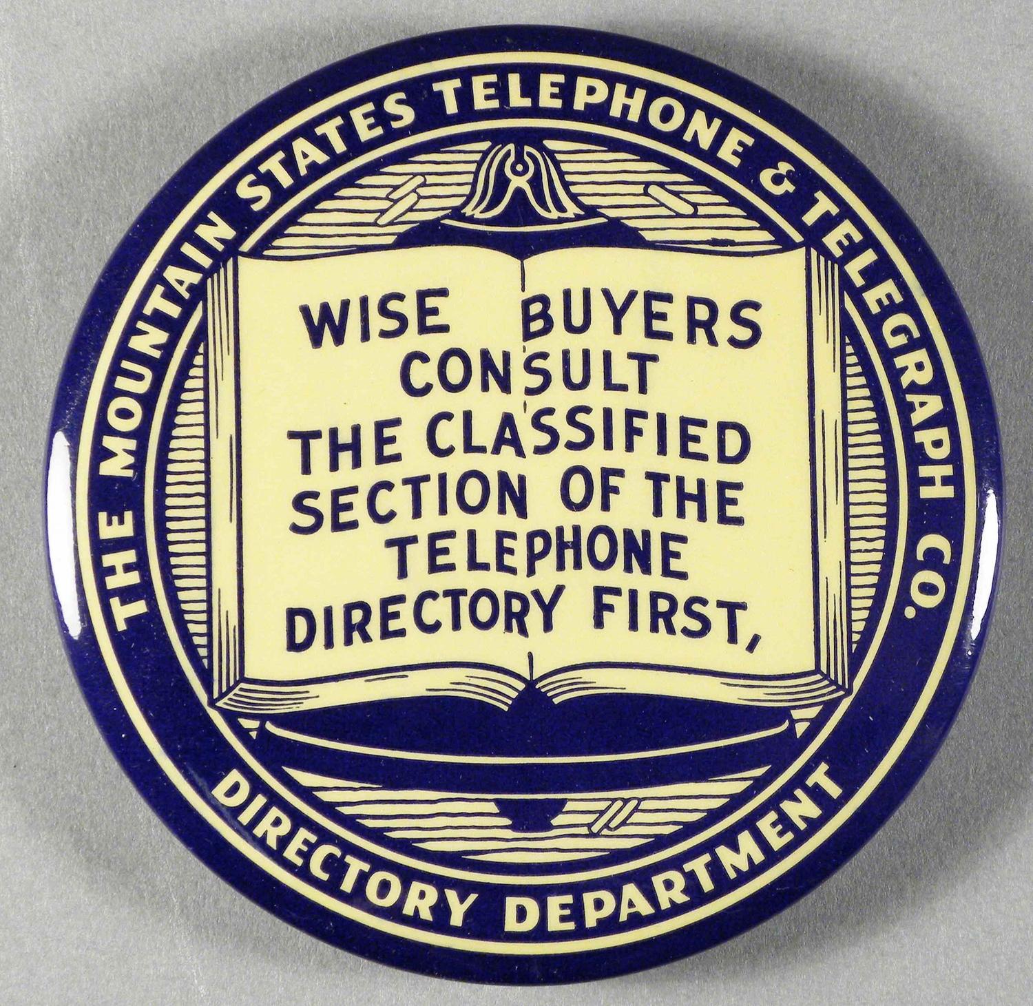 Celluloid Advertising Paper Weight and Mirror. The Mountain States Telephone & Telegraph Co. Directory Department. Excellent condition. 3 1/2 inch diameter. Starting bid $40