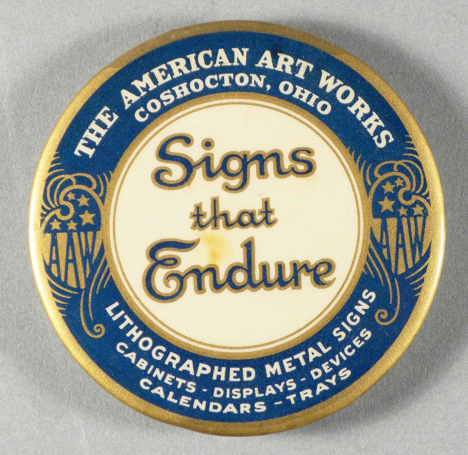Celluloid Advertising Paper Weight and Mirror. The American Art Works, Coshocton, Ohio. "Signs the Endure". Excellent condition. 3 inch diameter. Starting bid $30