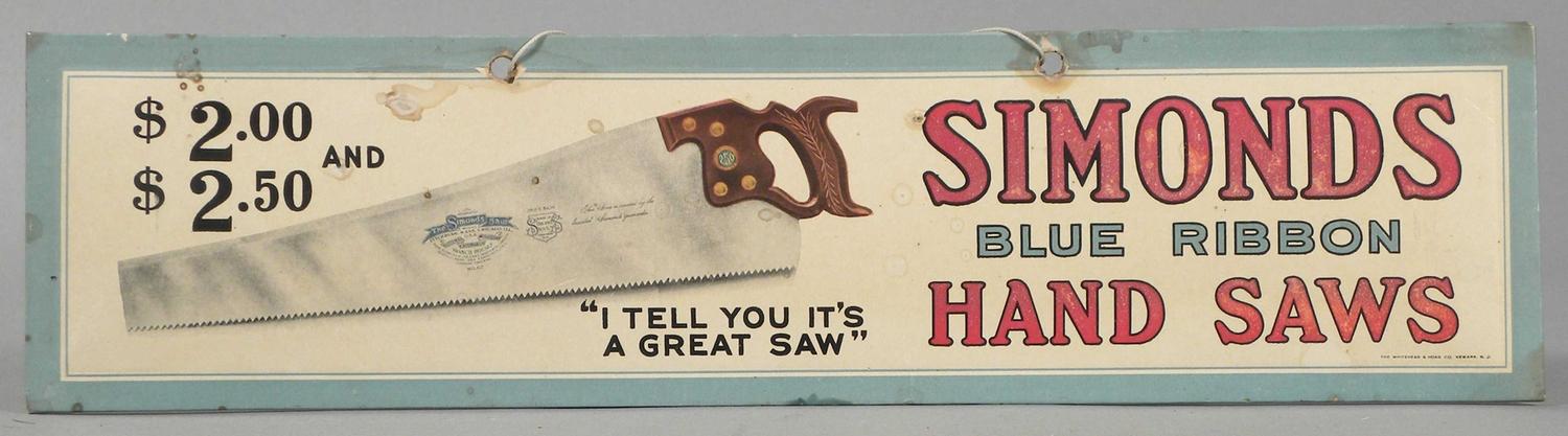 Celluloid String Hanging Sign over cardboard for Simonds Blue Ribbon Hand Saws. A couple of minor stains otherwise very good condition. 10 X 2 1/2 inches. Start Price $60